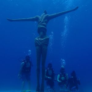 1ダイブ目は、水中美術館へ。様々なモニュメントがあり、全てに意味が込められているのだそう。ガイドさんに写真も撮って頂けました。そこから上がり、少し場所を移動。