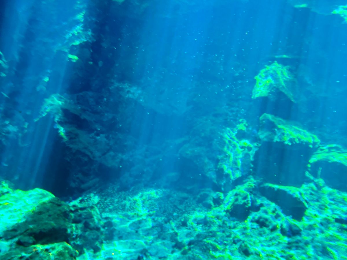 この度、初めてのカンクンで、この15時間弾丸ツアーに参加しました。朝早い出発でしたが、グランセノーテは一番乗り。誰もいないグランセノーテは、水も超綺麗で、水中の光の線がとても神秘的でした。