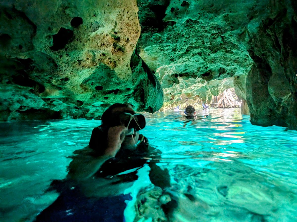 曇予報で、グラン・セノーテがどうなるかなと思ったけど、運良く太陽が出てくれ、キレイな光のカーテンが観れました!子供達も初シュノーケルで、小学生の子はちょっと苦戦したけれど、貸し出しのライフジャケットを着ていたのと、ロープもあったので、大丈夫でした。小さい子は、レンタルしてくれるゴーグルを使うよりも普段使っているゴーグルを持参した方が、慣れてて使いやすいかも?遊泳後の着替えはトイレでしましたが、私達のツアーが朝1番乗りなので、混み合うこともなくスムーズに済みました。この後の立ち寄るところのトイレも思ったよりもどこもキレイでした〜。