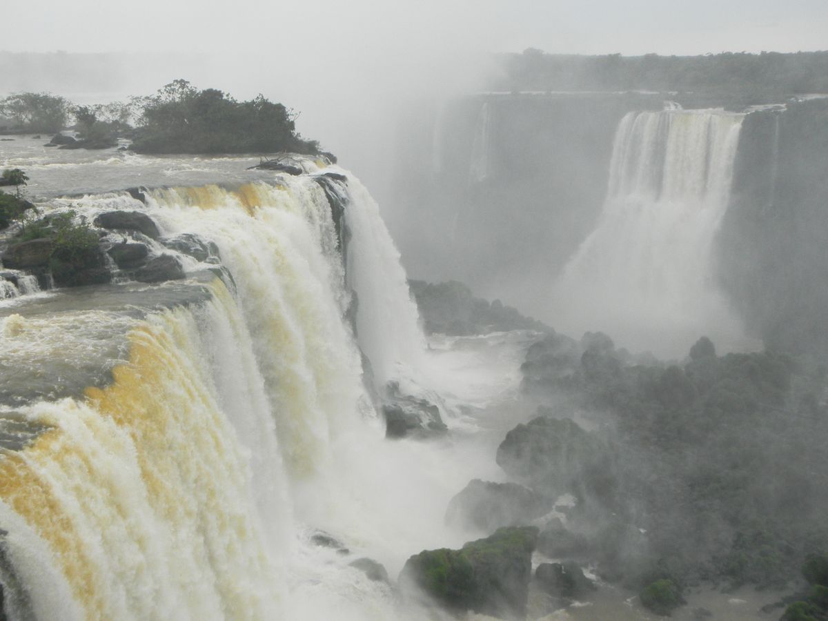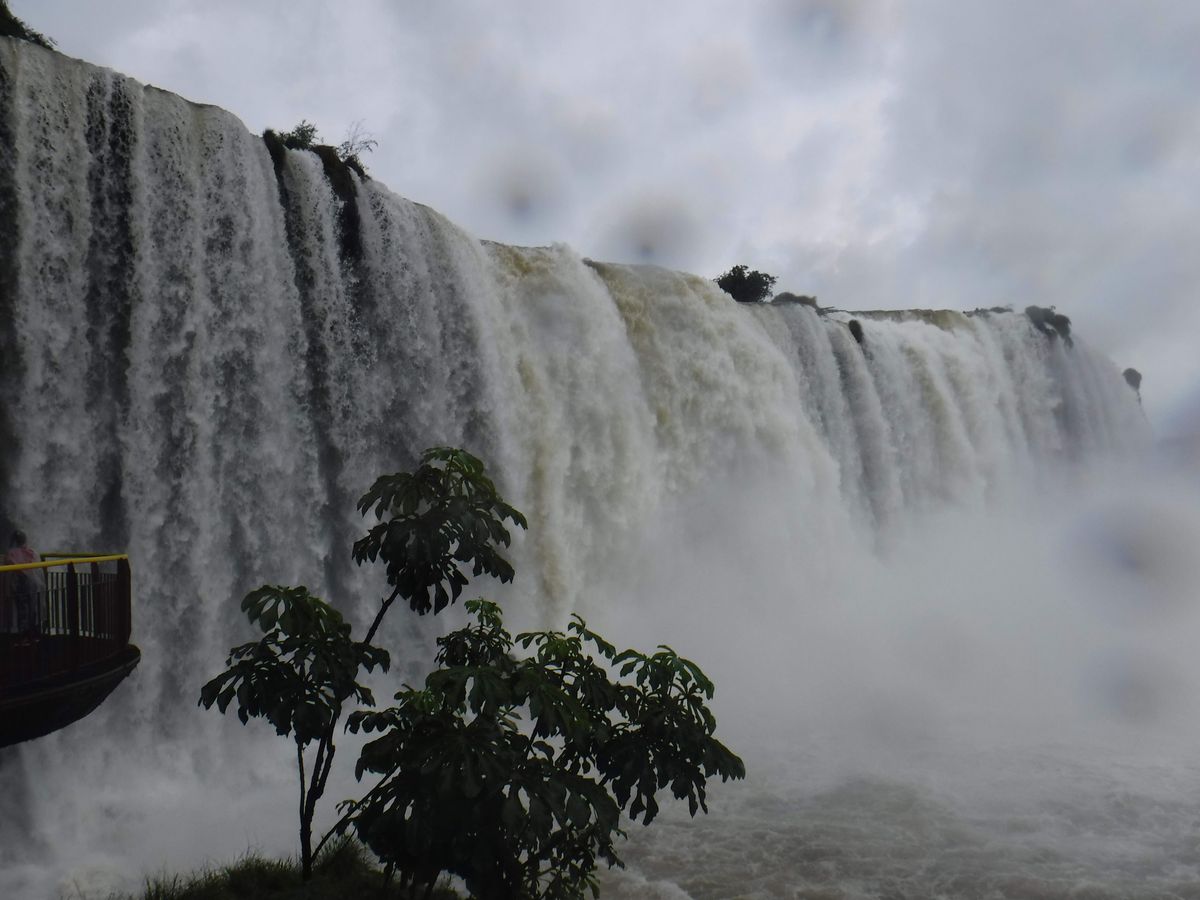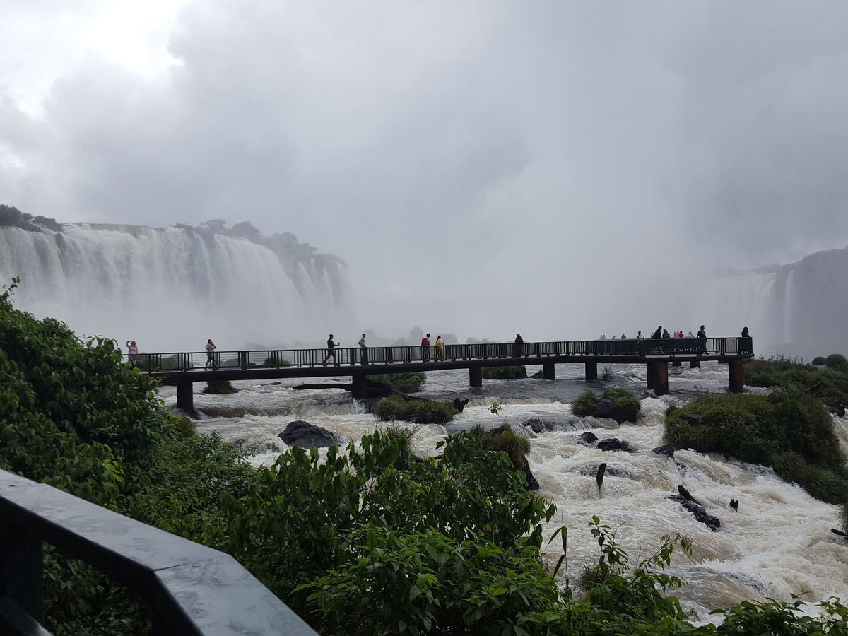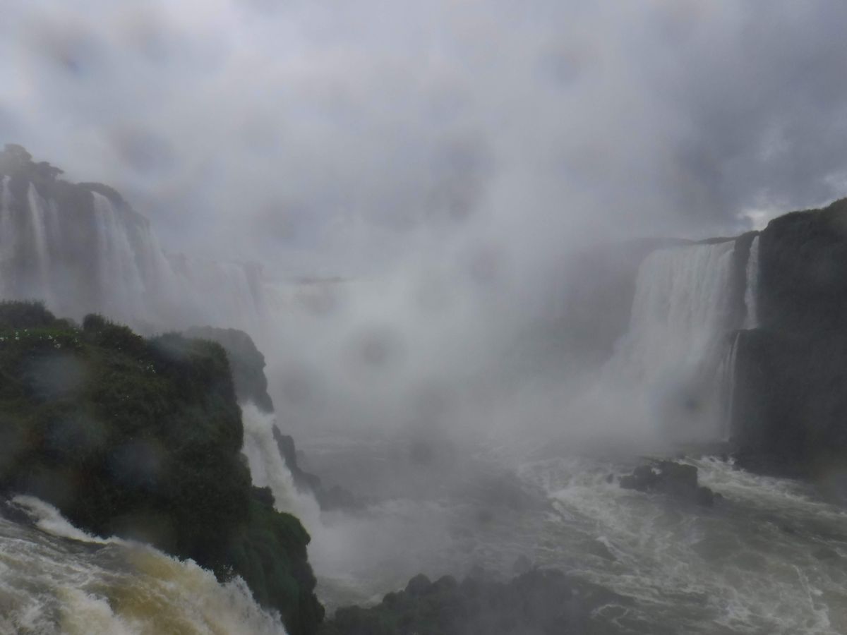車を動かす関係でガイドさんと途中別れましたが、道は1本だけなので、何も問題はなく、圧巻のパノラマビューを存分に味わいながら、ゆっくりトレックルートを歩くことができました。ところどころ展望&撮影スポットが作られており、角度によって表情が変わる滝のパノラマを楽しむことができます。トレッキングルートの途中でガイドさんと合流し、ブラジル側観光のハイライト、悪魔の喉笛を下から眺める桟橋へ向かいます。桟橋、川の真ん中から眺める滝はやはり迫力があり、水しぶきを全身に浴びてしまいました。国立公園に入る前に買っておいたカッパがとても役に立ちました。悪魔の喉笛の姿は、立ち込める霧ではっきりと見ることができませんでしたが、その存在感は遠くでも感じることができます。