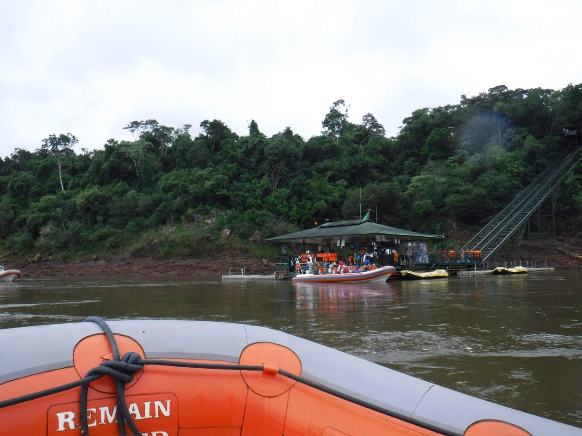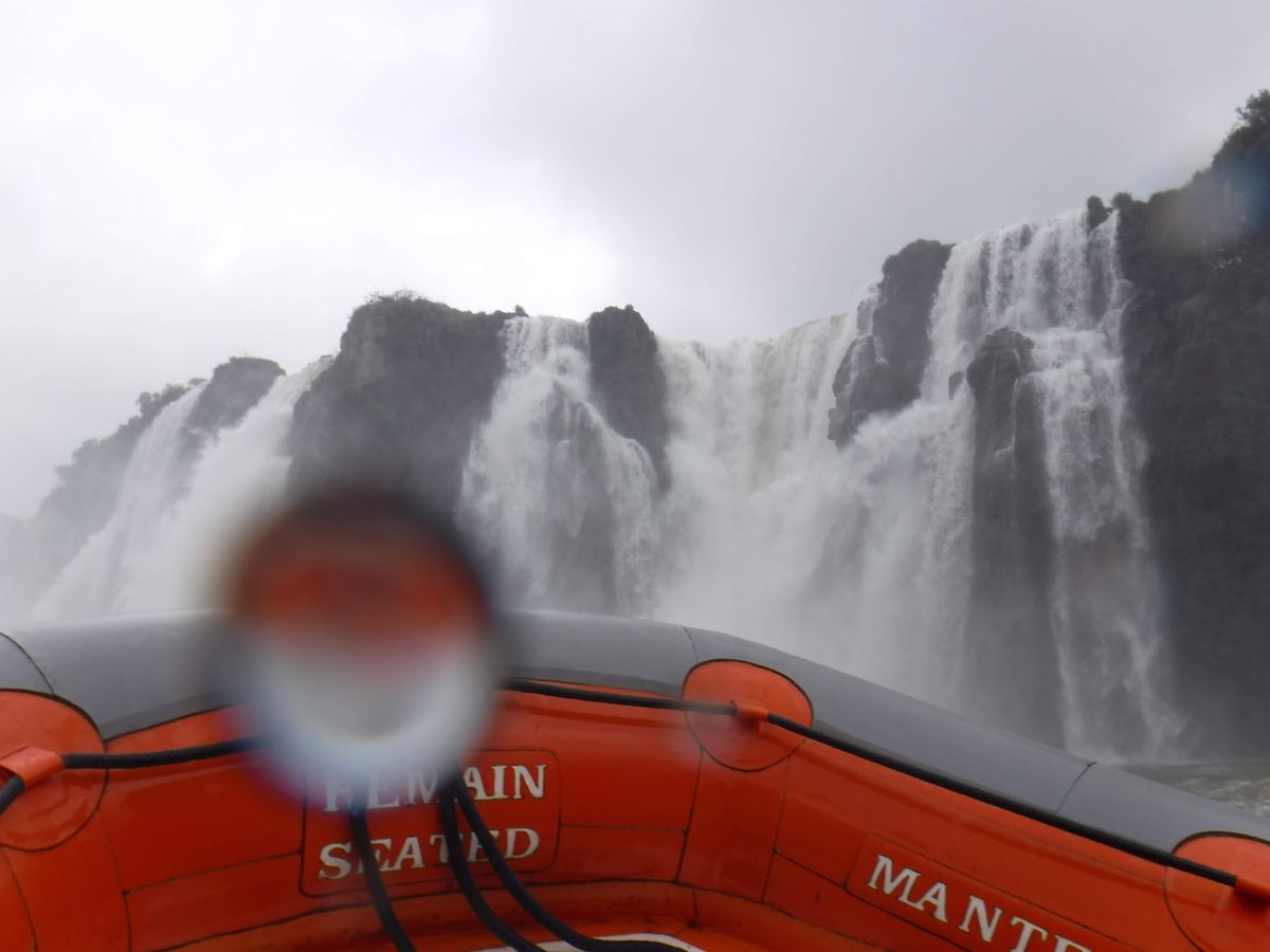 トレッキングが終わった後は、いよいよボートツアーです。ボートツアーの入口は国立公園の入り口側、手前にあるので、改めて道を引き返します。ブラジル側のボートツアーは、森の中を行くジープサファリとセットになっていて、国立公園内の植物や動物の解説もありました。車を2台乗り継ぎ、川面までのゴンドラに乗って、いよいよゴムボートへ乗船。一番前が一番いいとのことで、ガイドさんに取り計らってもらい、一番前の席に座ることができました。ガイド付きの良いところですね。ボートツアーはイグアス川を上流へ向かって進み、まずは滝を一望するスポットで撮影タイムがあります。さっきまで上から眺めていた滝を、川面から眺める感動は、またひとしおでした。