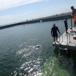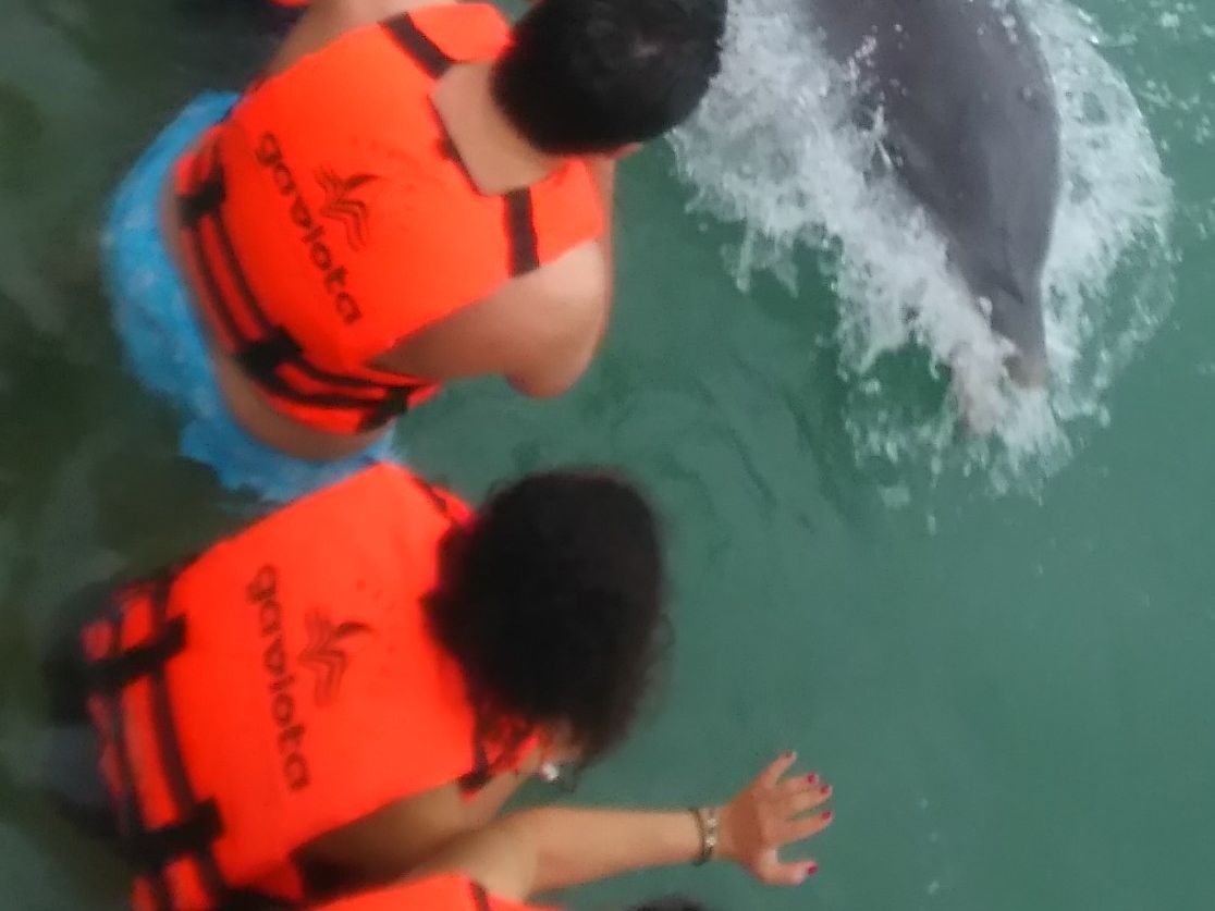 次にイルカと触れ合いタイムです。全く同じ内容を2セット行っているので、二人で来た人は別の回に参加するとイルカとの写真をお互いに撮り合うことができます。私たちはスペイン語が理解できなかったので後から気づいたのですが、、w