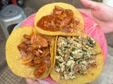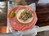 午前11時、時間通りピックアップしていただき、まずは豚肉を引き裂いたカニータスタコス屋さんへ向かいました。朝タコスで人気のお店という事で、大きな鍋にいっぱいのお肉がなくなったところで閉店とのこと。なんと私達3人とガイドさんの4名分を注文したところで閉店となりました。辛いソース少々とライムをたっぷりかけていただきました。メキシコのタコスは初めてではありませんでしたが、塩加減も大変よく美味しくいただいました。