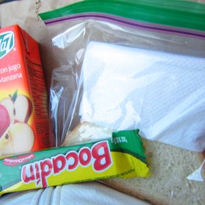 サンドイッチ、果物、お菓子、ジュースのランチパックを渡されます。