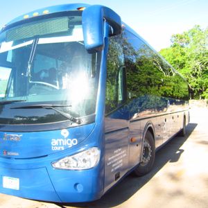 いくつかの送迎バスが集まってきて、集合場所で大きな観光バスに乗り換えチチェン・イツァへ出発です