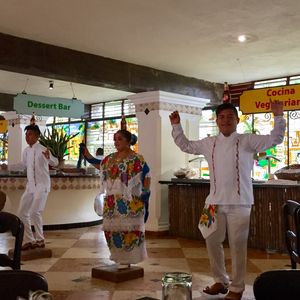 遺跡を見学した後はプラネタリウムでマヤ文明について学び、儀式を体験し、その後マヤホテルでビュッフェでした。ビュッフェは種類が豊富で良かったです。特にタコスはトルティーヤを目の前で手作りされていて、とても美味しかったです。マヤ料理もあり、美味しかったです。踊りのパフォーマンスも楽しめました。