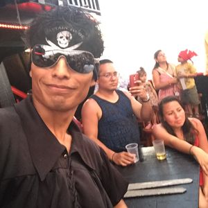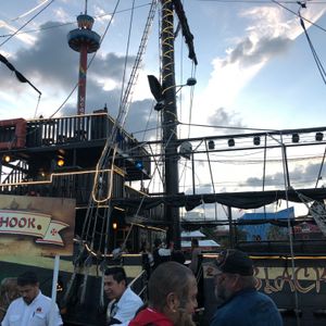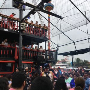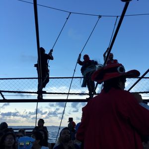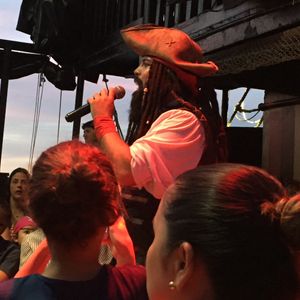子供4人連れて家族6人で参加しました。キャプテンフックの巧みな話術に乗せられて、最後は参加者全員がクルーになったような気分にさせられます。乗船者参加型の余興あり、懐メロから最新のミュージックまで流れるダンスタイムあり、海賊たちのパフォーマンスありと盛り沢山でした。私達はステーキ&ロブスターにしましたが、食事を楽しむよりショーがメインだと思いました。ココボンゴのような18禁のクラブではないので、子供達は思いっきり踊れてすごく楽しかったみたいです。またメキシコ人ですが日本語を話せるクルーもいて、すごく助かりました。絶対おすすめです!