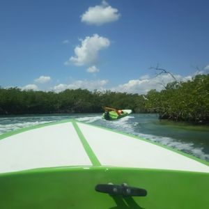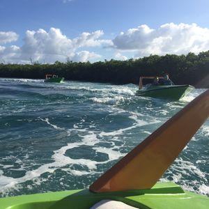 カンクンでしか体験できないボードの運転❣️猛スピードで前のボードに追いつく為運転する50代熟女!スリル満点シュノーケルは、魚、海も綺麗でした。保険代と海洋使用料12ドル別に徴収されます。