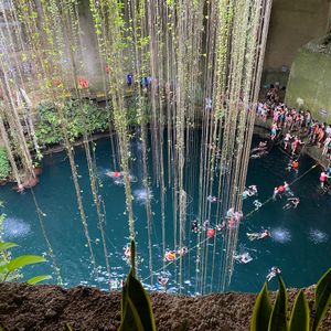 セノーテイキルでは、到着したのが午後のため多くの人が飛び込みをしていました。地上から泉まで降りるのは階段で面倒に感じるかも…ですが、下まで降りて天上を見上げると美しい写真が撮れます。