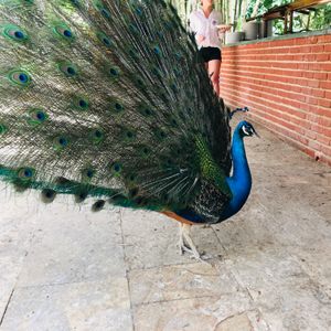 ランチはビュッフェでした。私はスタッフにパンと挟む具(ハンバーグ、野菜)をその場で焼いてもらい、ハンバーガーを食べました。注文したハイビスカスのジュースはおいしかったです。ここでのトピックは孔雀を触れられるくらい間近で見たことでしょうか。