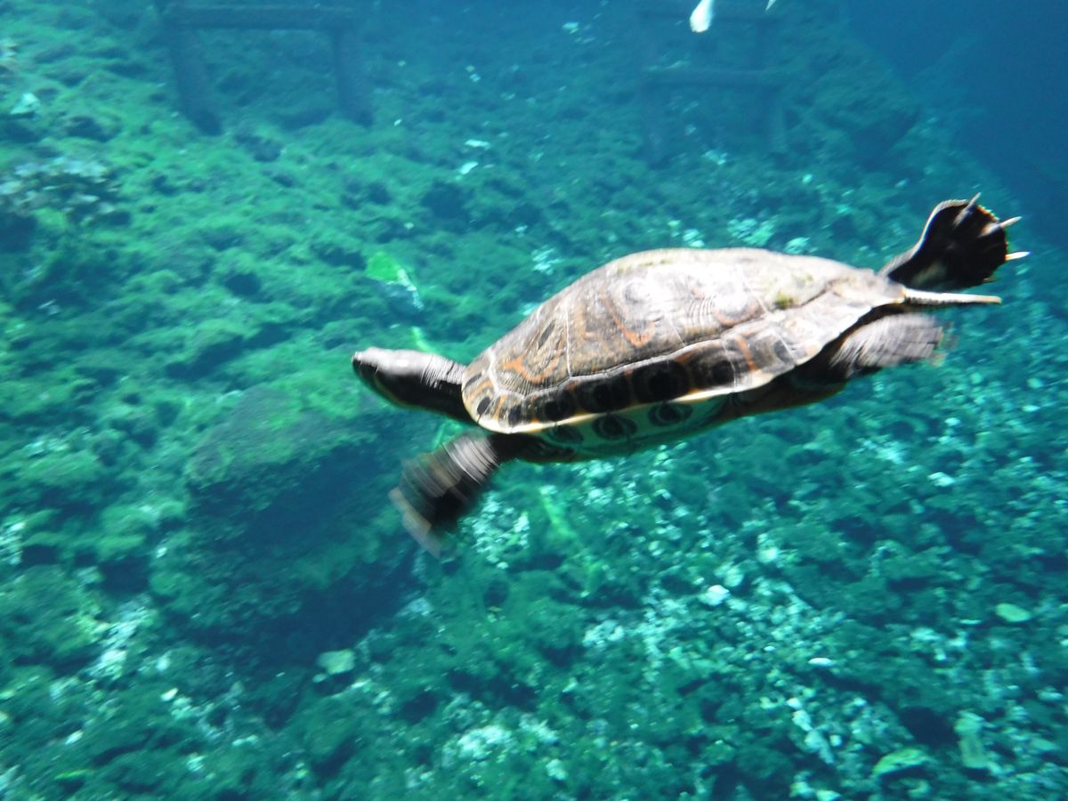 亀もいた。小さめの亀がプリズムの光を避けるようにすいすい泳いでいた。