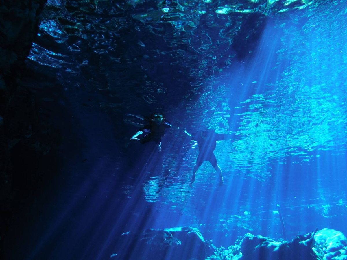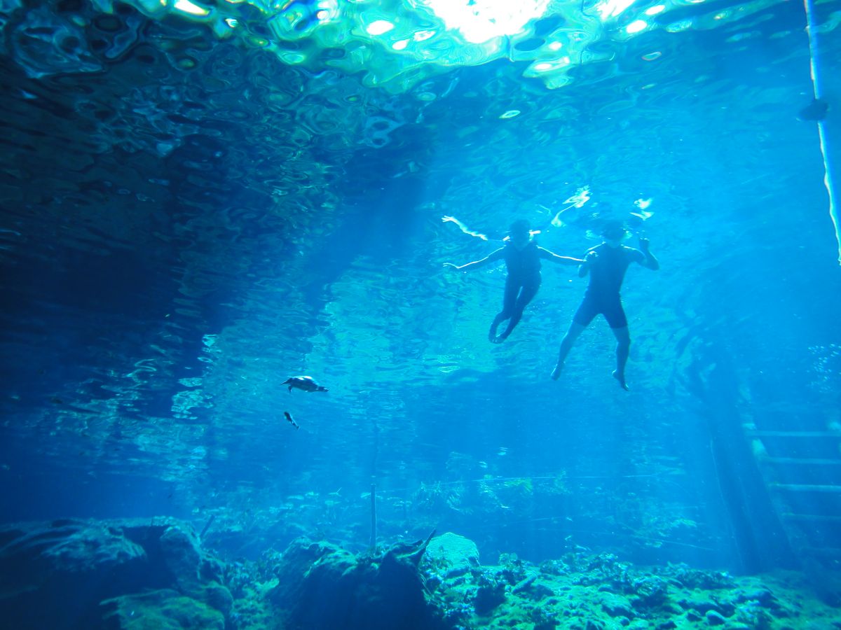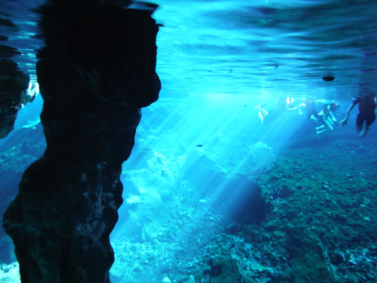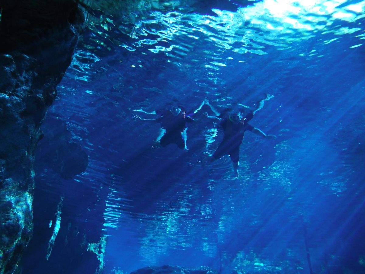 グランセノーテにはオープンと同時に入場し、澄み切った水の中美しい光のカーテンを見ることができました。ガイドの小林さんが、一緒にシュノーケリングをしながら案内をしてくれるので安心です。