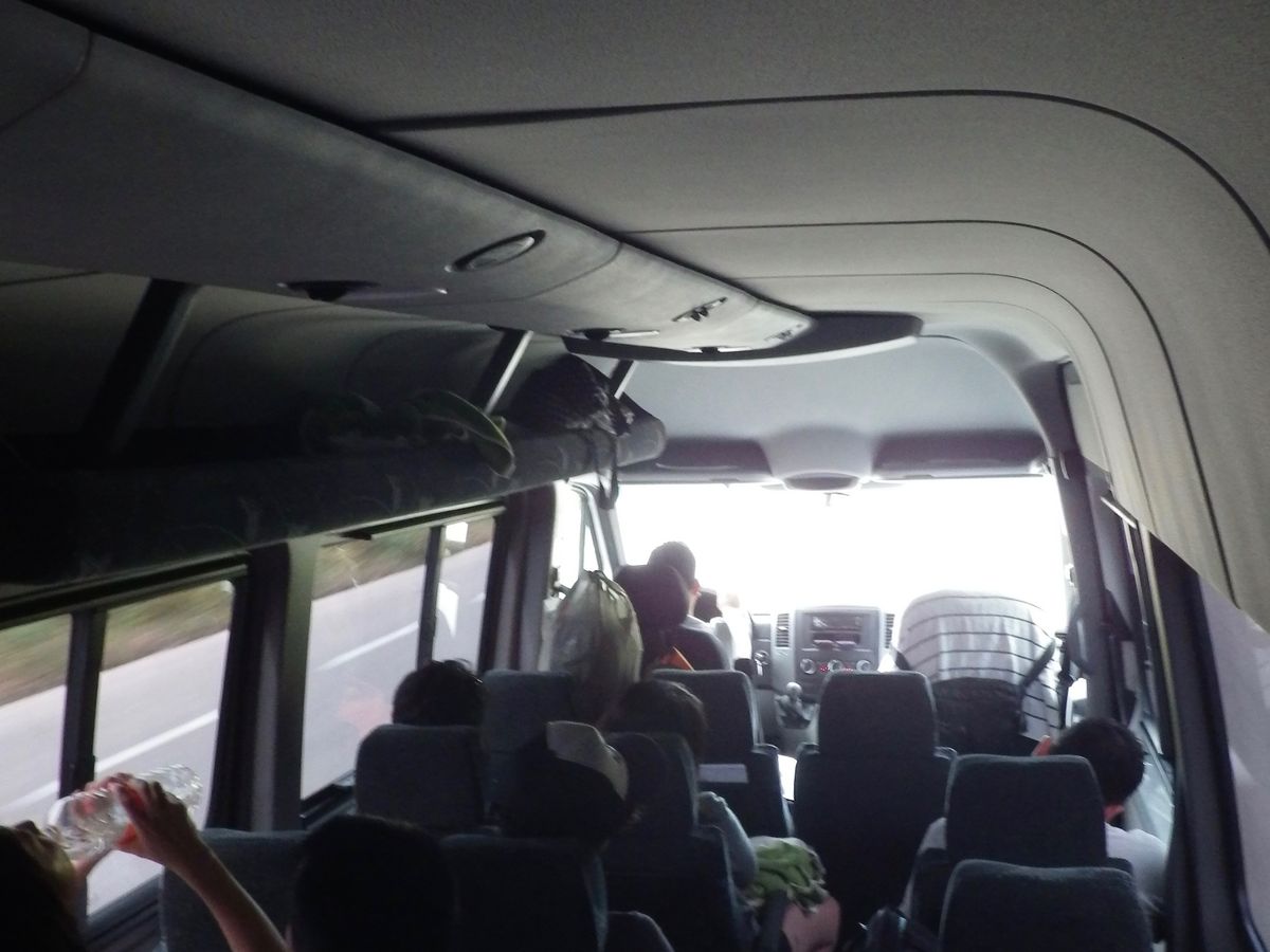 4、おそらく使われるであろう、移動バスの機材内です。一番後ろの席からの撮影です。(朝のセノーテへの移動時間2時間内に軽い機内食でましたwパンに何か塗ったやつ。)