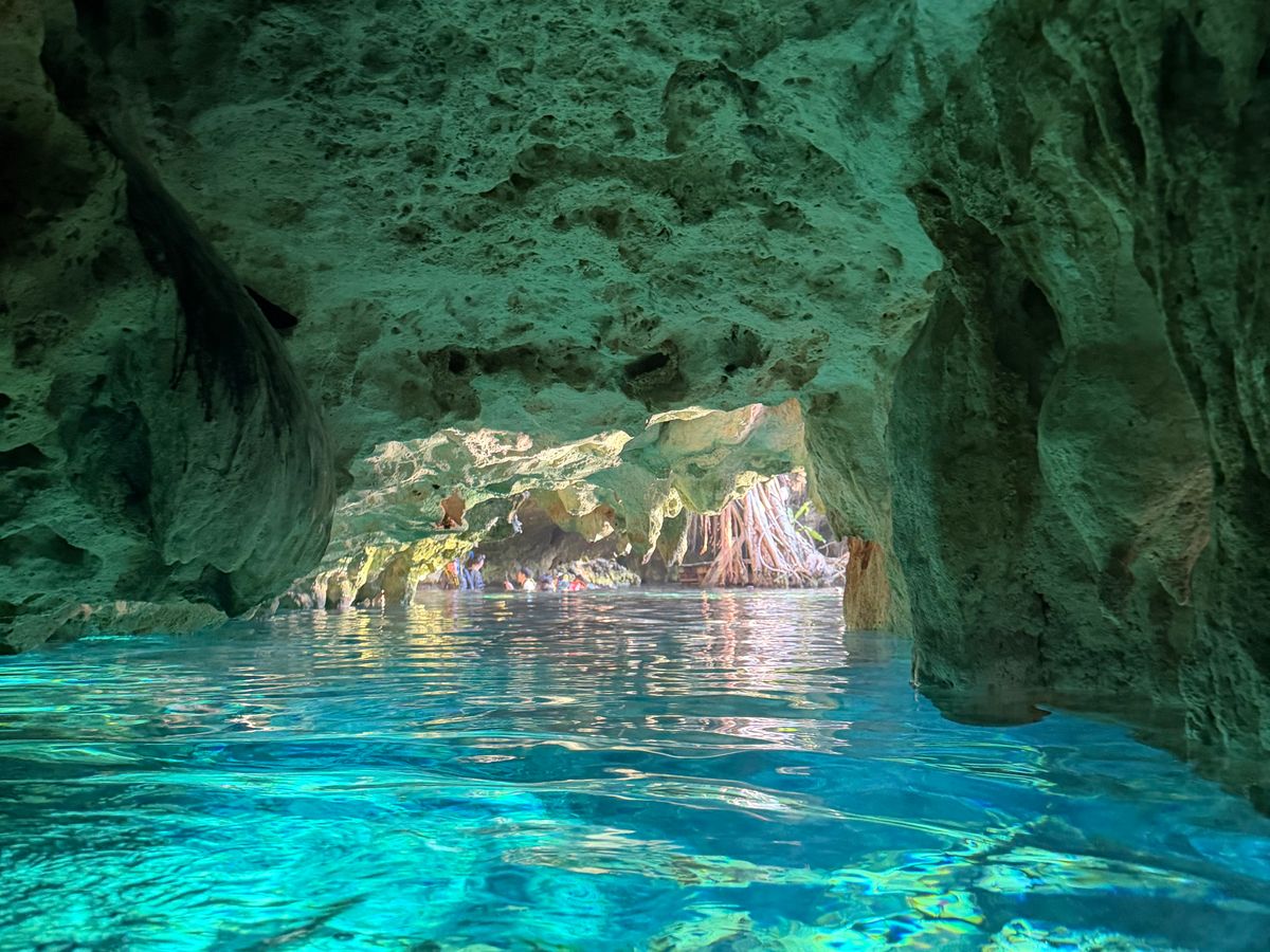他ツアーでセノーテイキルにも入ったが、グランセノーテは透明度が高く、シュノーケリングでは亀や多種類の魚と一緒に泳ぐことができた。コウモリの声と水の滴る音、洞窟の中の鍾乳洞、光のカーテンが輝く様子、とても神秘的でよかった。