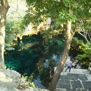 セノーテを取り囲む鮮やかな緑と、強い日光との対比が非常にきれいでした。中に入ってみると水の透明度は高く、水面近くまで垂れ下がる石灰岩のツララも見事でした。