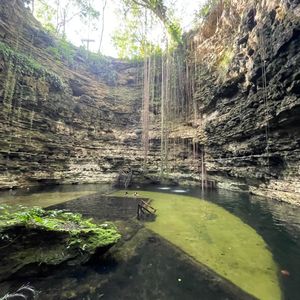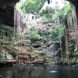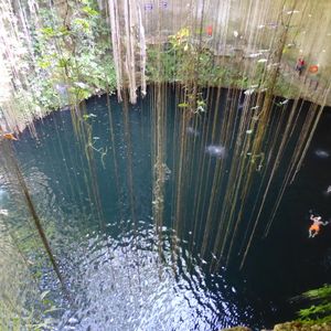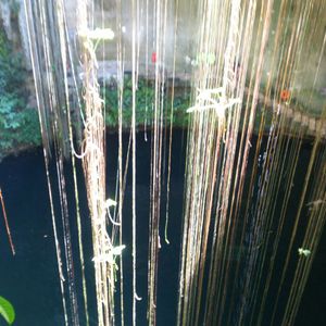グランセノーテは水の中が美しいですが、セノーテイキルはその形が面白いです。大きい丸井戸のような形で、上から植物の根が垂れ下がり、光が差し込んでとても美しいです。暑かったので、いいクールダウンとなりました。