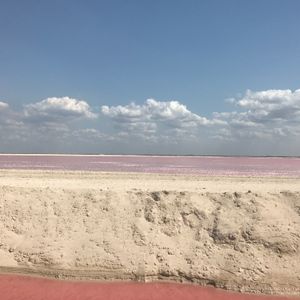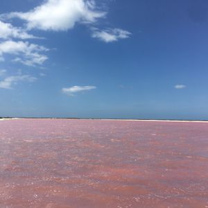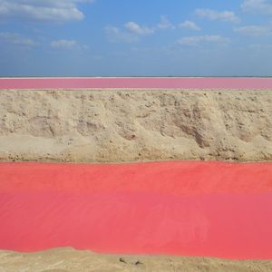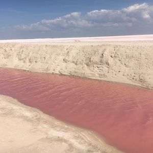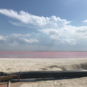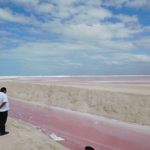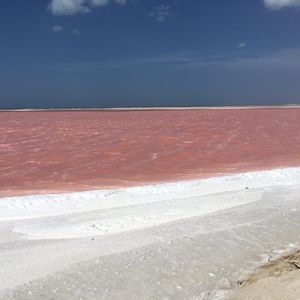 昼食を食べてメキシコ湾の小さな漁村「リオ・ラガルトス」へ向かいます。まずはプランクトンの色素が原因でピンク色に見える塩田ピンクレイクへ。世界でもなかなか見る事のできない絶景です!!