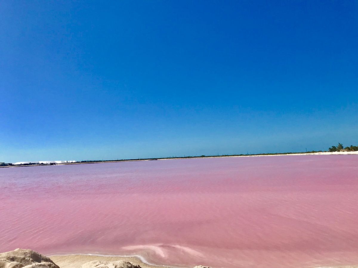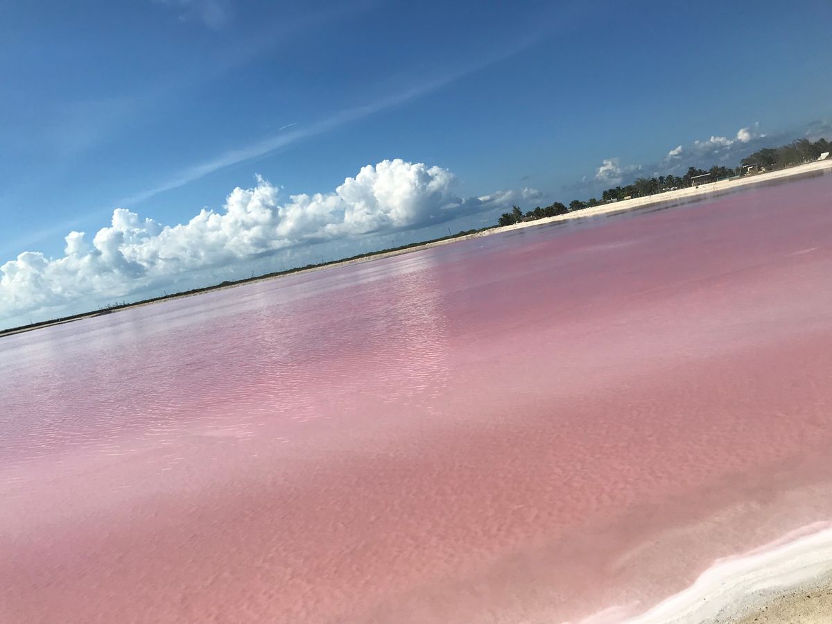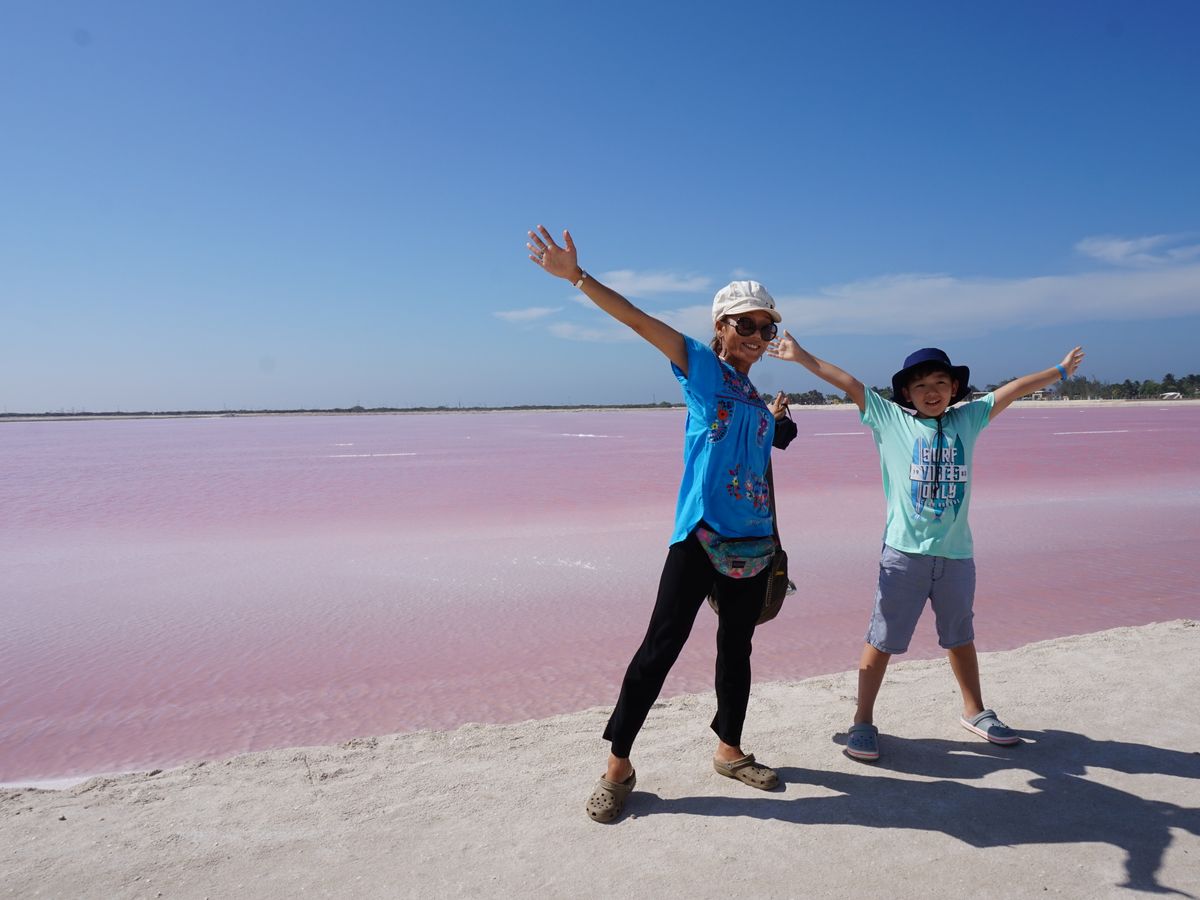 セノーテイキルでランチ後ピンクレイクへ、うちの家族の自称晴れ女2人のおかげもあり!?塩田は鮮やかなピンクを演出、ピンクだけに林家パー子の登場によりナイスな写真もたくさん撮ってもらえました。