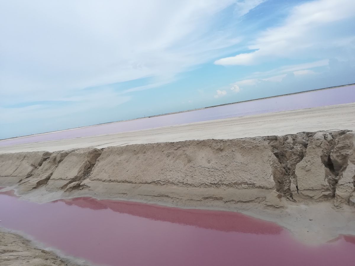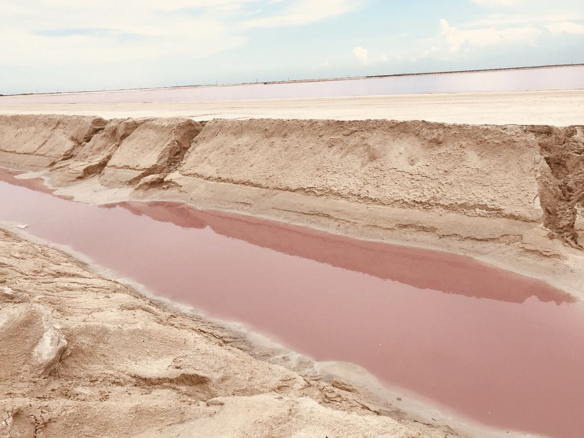 塩湖は淡いピンクです。その前にある細く掘られた部分は強いピンクでした。