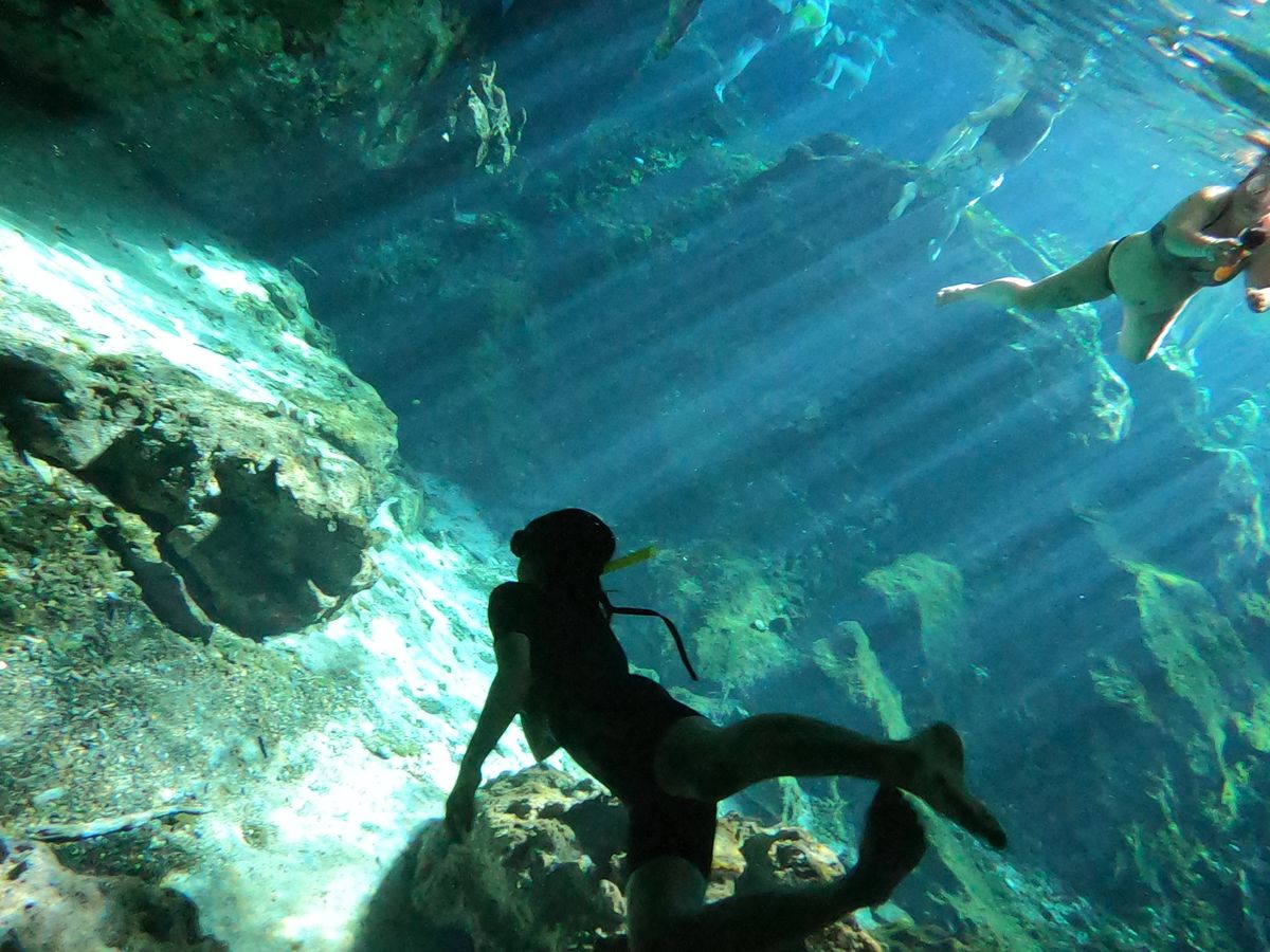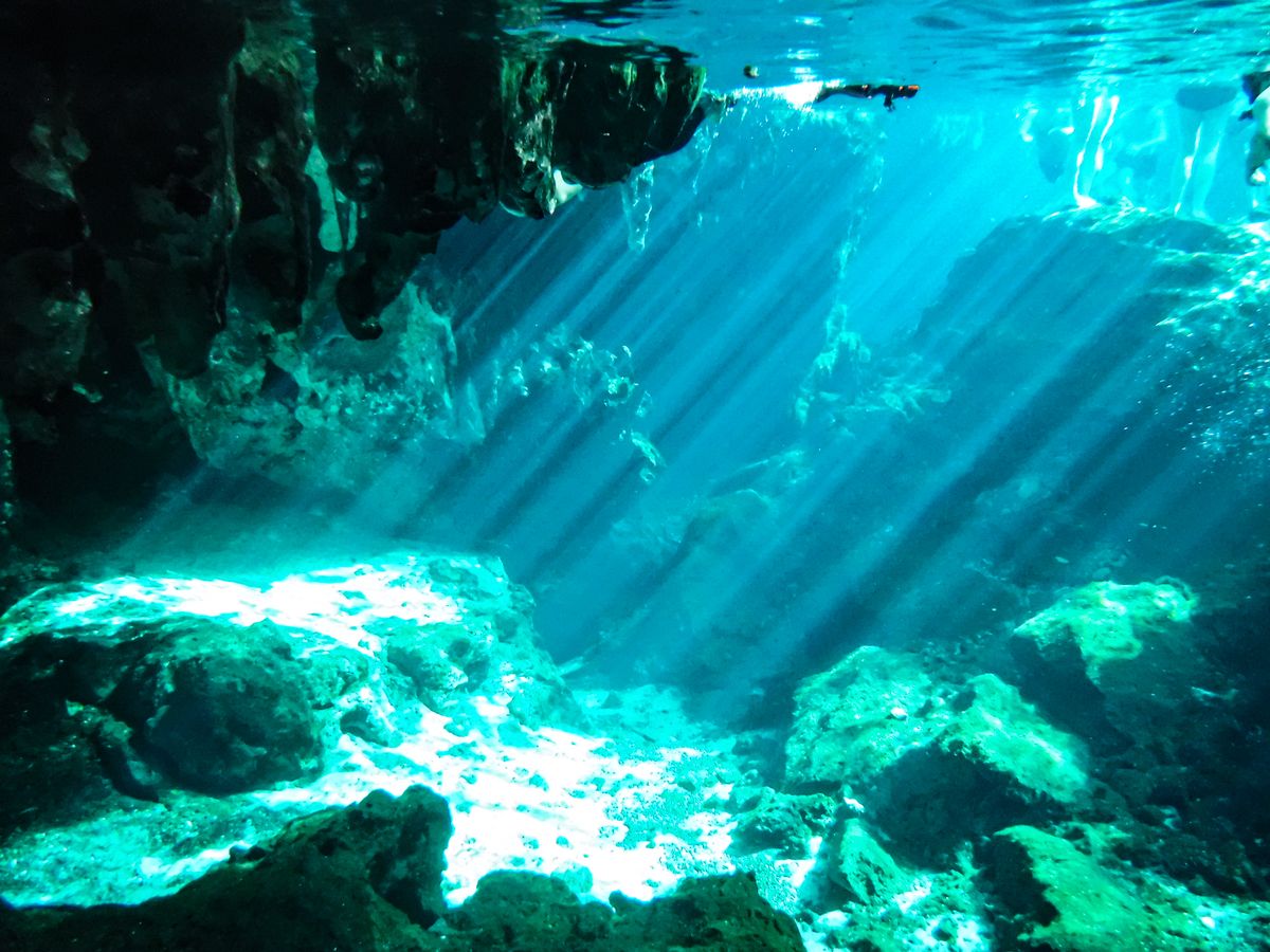 朝は曇っていたのですが、セノーテでは光がさし光のカーテンを見ることができました!初めて見る光景で感動しました。