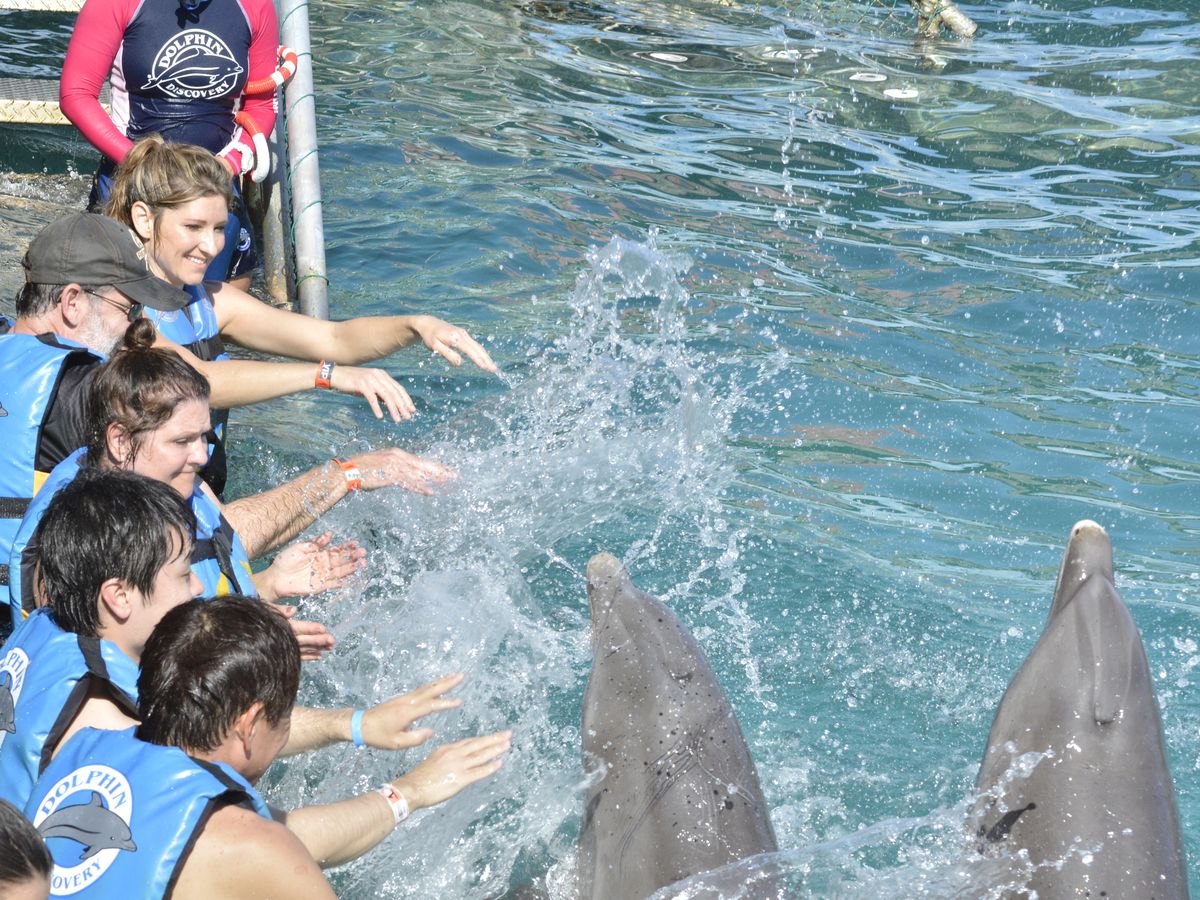イルカ2匹と遊べるということで、イスラ・ムヘーレス島のロイヤルスイムに申込みました。初めての体験でしたが、とても楽しく満喫しました。トレーナーさんはスペイン語と少し英語を話しますが、動作で何をしたらよいかはわかるので、大丈夫です。6名程度のグループで行動するので、後ろの方に並ぶとどういう風にしたらよいか前の人の行動でよく理解できると思います。このプログラム中は、水着とライフベストしか着用できず、写真は専門のカメラマンが撮ります。写真は、ロイヤルスイム終了後に、各自で確認することができ、欲しい画像を選んでCDにしてくれます(有料です)。