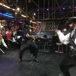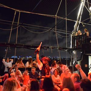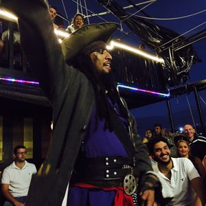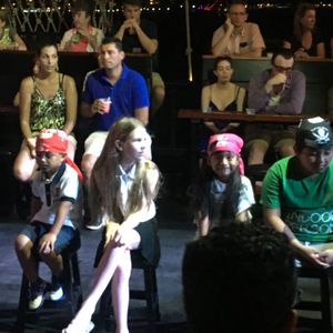 子供4人連れて家族6人で参加しました。キャプテンフックの巧みな話術に乗せられて、最後は参加者全員がクルーになったような気分にさせられます。乗船者参加型の余興あり、懐メロから最新のミュージックまで流れるダンスタイムあり、海賊たちのパフォーマンスありと盛り沢山でした。私達はステーキ&ロブスターにしましたが、食事を楽しむよりショーがメインだと思いました。ココボンゴのような18禁のクラブではないので、子供達は思いっきり踊れてすごく楽しかったみたいです。またメキシコ人ですが日本語を話せるクルーもいて、すごく助かりました。絶対おすすめです!