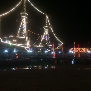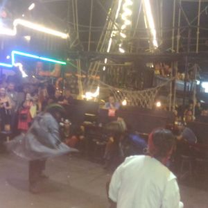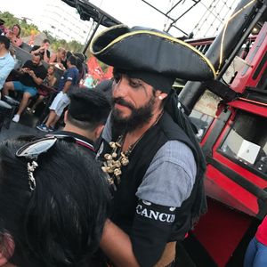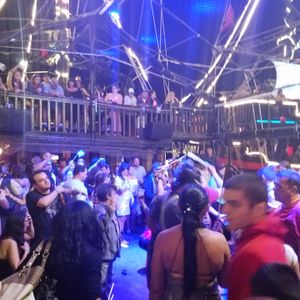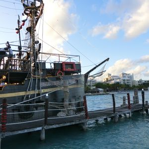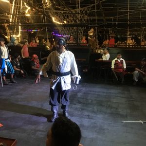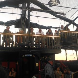 カンクン1日目の夜に参加しました。バウチャーからチケットを交換し、海賊船へと向かう間にも雰囲気のある海賊の像がたくさんあり写真をたくさん撮らせていただきました!準備中の海賊船の付近では海賊の方がペイントをしてくれたり、笛合戦でお客さんを楽しませたりと待機時間も飽きないような工夫がされていました。私達はとりあえず$5のバケツビール(ビール4本とナッツ類)を購入し乾杯しました。最初に海賊船を見た時は船の形をした建物だと思っていたので、船が出航した時の興奮は凄かったです。海賊船で働く1人の方とペインティングと彼が日本語を学んでいることをキッカケに仲良くなり、パフォーマンスの際にはたくさんイジっていただきました(笑)彼はアクロバットのパフォーマンスもしていて、船の一番上からロープ一本で宙吊りになったりしてとても迫力があり大興奮でした!アジアからの客が私と彼だけだったのもあり、周りのお客さんからも遠いところから来たね!と、とても気さくに話しかけてくれたり、ダンスを教えてくれたりと本当に楽しかったです!お客さんがたくさんいるので、順番にご飯を食べる部屋に案内されるのですが、段取りよく案内されるし、パフォーマンスは続いてるので待っているという気分にはならなかったです。ステーキもボリュームがあり柔らかくとても美味しかったです。ステーキ以外はバイキング形式になっていたので大食いの彼氏も大満足そうでした。またドリンクもなくなったらすぐに海賊の方が次のドリンクを聞きに来てくれるので良かったです。