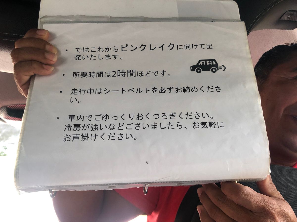 朝の迎えから遺跡の見学終了までは日本人のガイドさんが同行してくれ、遺跡でもとても詳しく説明をしてくれました。遺跡見学の途中でピンクレイクに行くグループと行かないグループで分かれます。ピンクレイクに行く人はそこでガイドさんとは別になりますが、現地人のドライバーさんが日本語で説明が書かれたボードを持っていてそれで説明してくれるので特に困ることはありません。