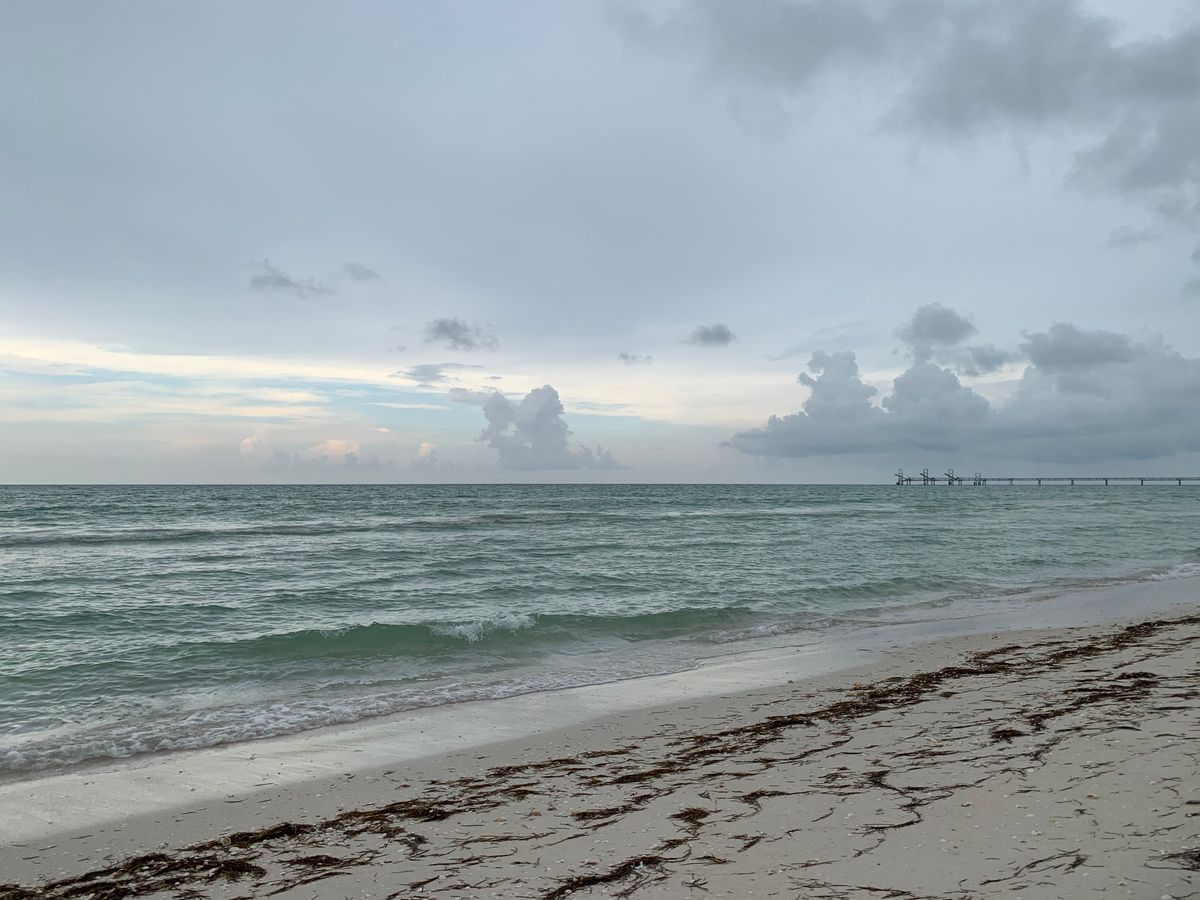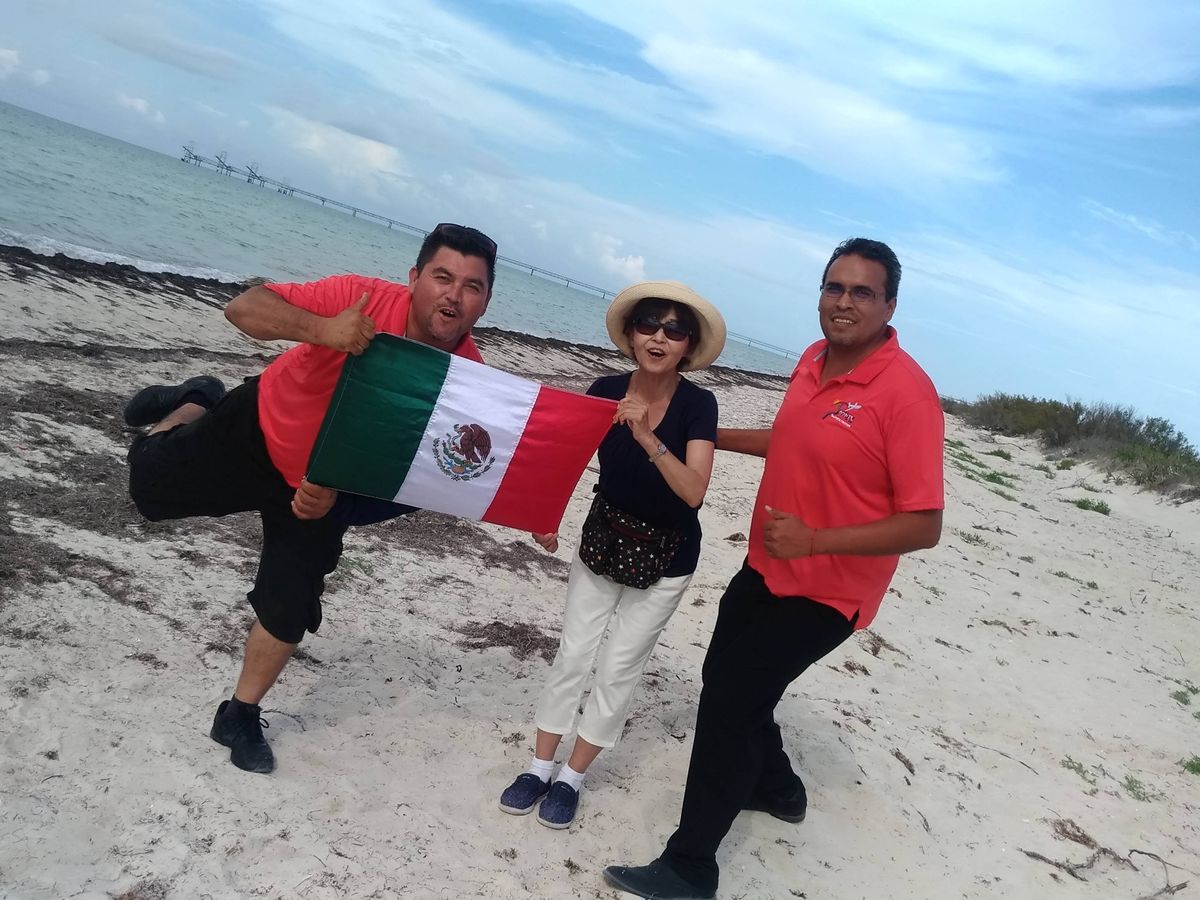 そこからは車で移動すること5〜10分、メキシコ湾ビーチで写真撮影です。カンクンの海とは色の違うビーチでメキシコの旗を持って記念撮影をしました。