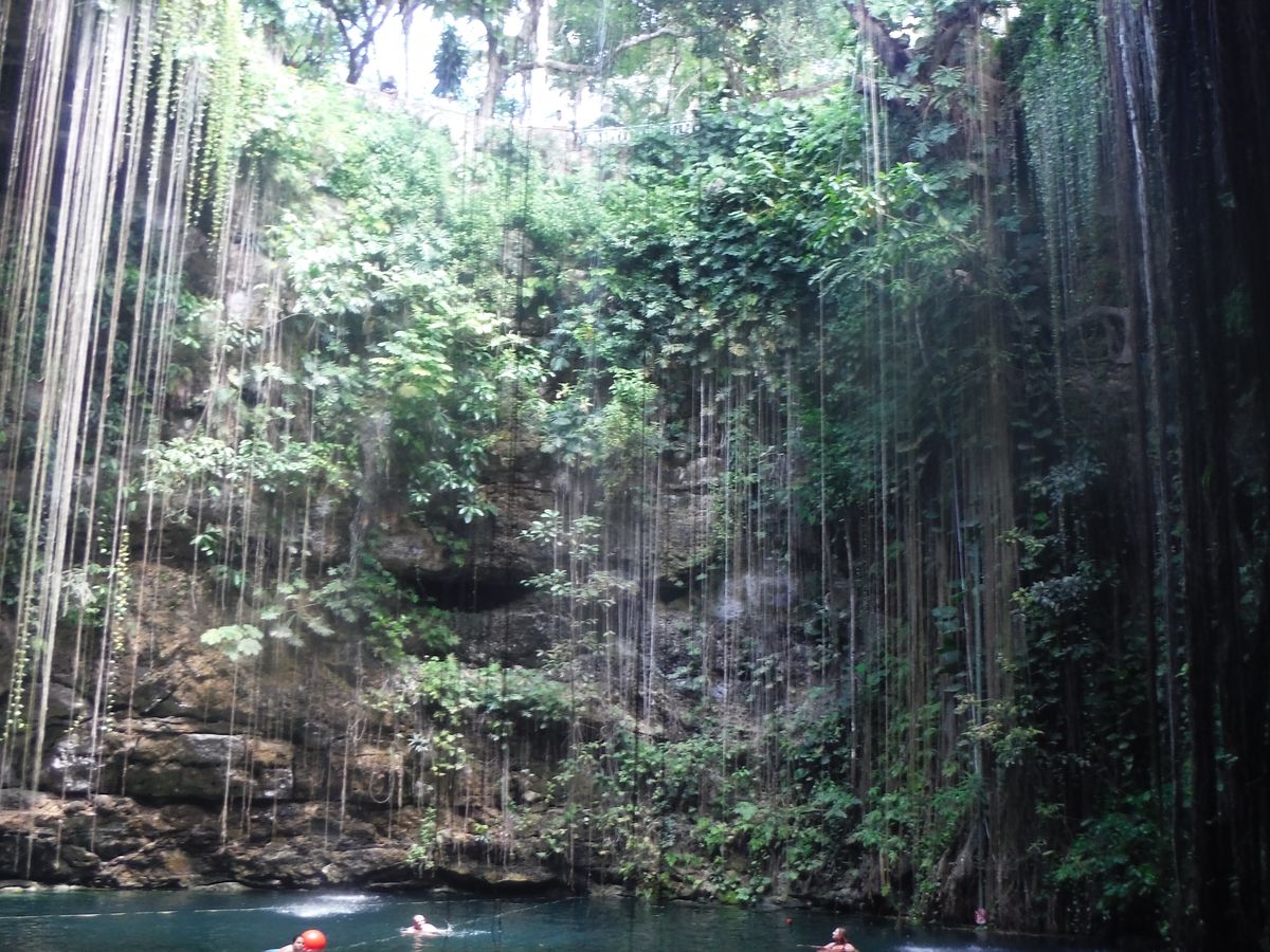 その後セノーテイキルで泳ぎました。時間が限られているので、朝から水着を着ていくとすぐ泳げました。水中カメラを貸していただいたのですが水中の透明度はあまりよくないです。