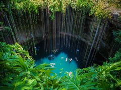 石灰岩地帯にできた天然の泉、セノーテ。その中でも観光客に人気のあるセノーテイキルは井戸型のセノーテで、深部には大きな鍾乳洞が存在していることで有名です。見渡す限りの青の世界がひと時の安らぎの空間を作り出してくれます。