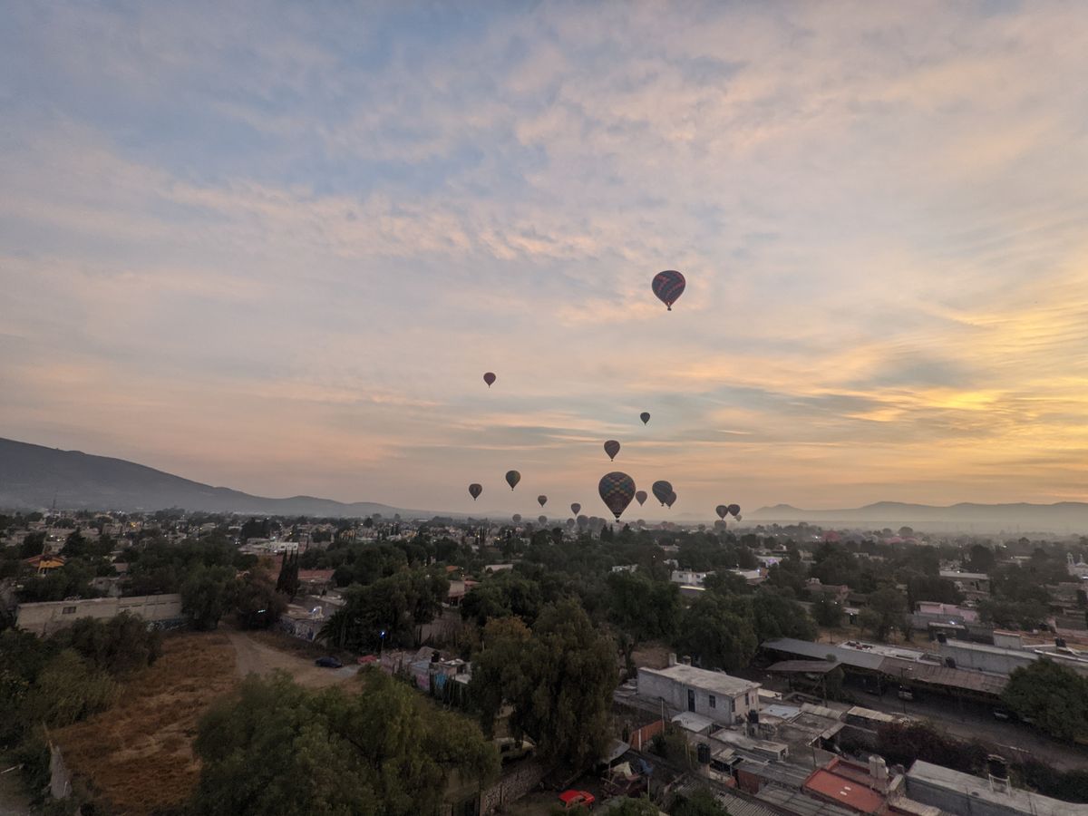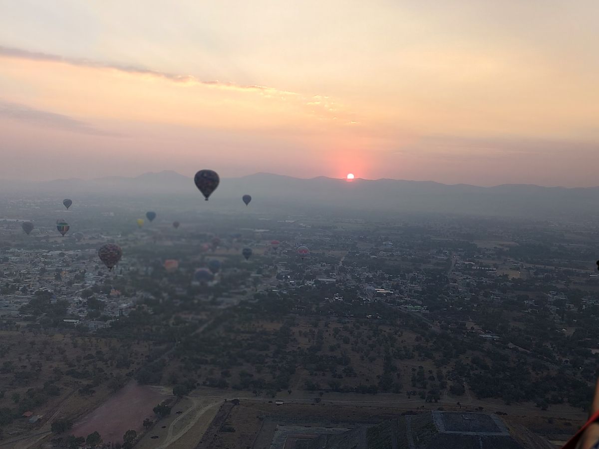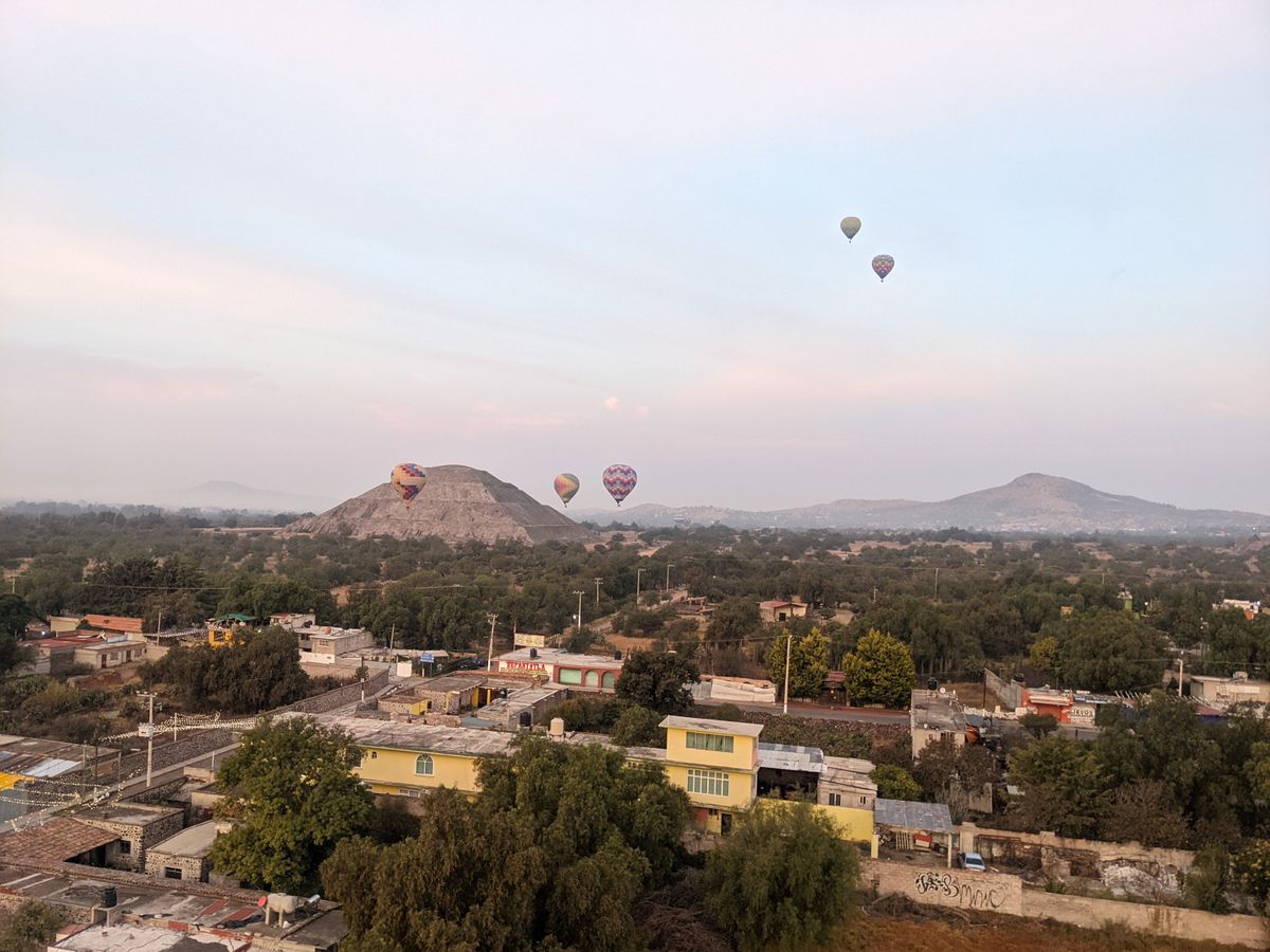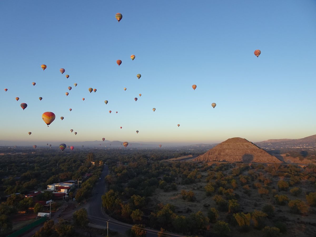 朝5時頃にホテルに迎えが来て、6時頃に事務所でコーヒーをいただき、気球に乗ります。ちょうど夜明けの時間帯で、テオティワカンが上から見れるのはもちろん、気球がたくさん浮かんだ夜明けがとてもきれいでした。