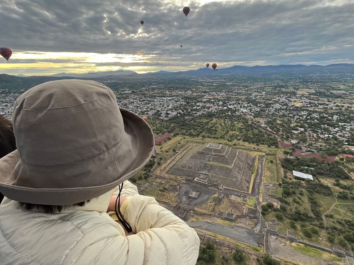 ・気球観光:ホテルまで迎えに来てもらえたので良かったです。朝の5時は暗く、一人で参加だったので他の場所へ行くのは心配でした。気球の発着場所で名前を書いたりして申し込みしますが、説明がスペイン語で、付け足し程度に英語。語学力に自信があれば良いですが、わからなければ積極的に自分で確認しないといけないと思います。気球に乗っている間に写真を撮影してくれるサービスを有料で申し込むことができました。800ペソでしたが、思い切って申し込みしました。一人で参加だったので写真がうまく撮れないと思ったからです。カメラマンが1人ついてくれて、場所やスケジュールについて教えてくれたので、とても助かりました。気球が準備しているところも近くから見ることができました。気球からの眺めは素晴らしく、またドローンで動画も撮ってもらえて、帰国してから見ることができたのも良かったです。朝食の後、ティオティワカンへ移動して見学。朝迎えに来てもらった車に乗った人は皆同じようにティオティワカンへ移動しましたが、移動前に「ティオティワカンへ行くか、すぐにホテルに戻るか」聞かれました。同じ車に15人程度乗車、その中で私を含めて4人スペイン語圏ではない人がいました。ドライバーは英語が話せず、気球の発着場所、ティオティワカンなど車を降りて各自で行動する時には、英語を話す人が来て説明をしてくれました。気球や送迎の車で一緒になったペルー人の家族と仲良くなり、集合時間も彼らに確認でき、遺跡も一緒に見学でき、とても楽しい体験となりました。ティオティワカンの後にさらにどこかを見学するツアーに申し込んでいる人もいるようで、私はティオティワカンで別の車に乗り換えてホテルに戻りました。