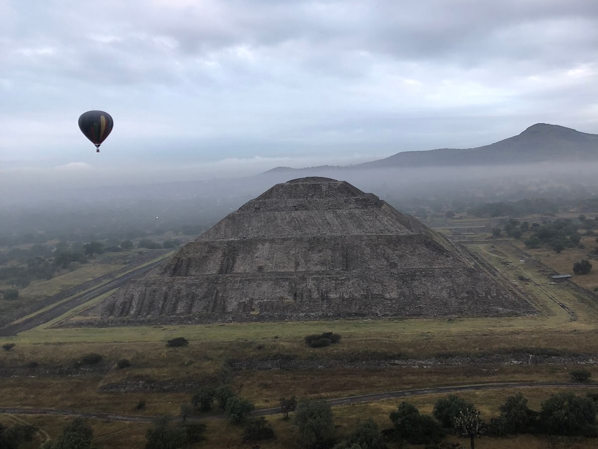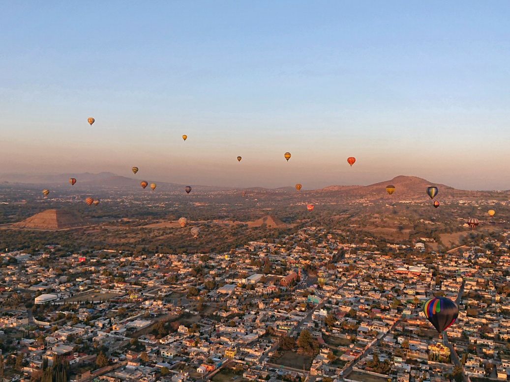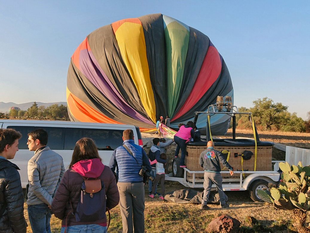 初めての気球体験、経験する前は墜落の危険も考えましたが、終わってみれば、気球は楽しかったの一言につきます。気球が空に昇っていくとき、、朝早い時間にもかかわらず、HISの方が、「よい旅を!」と大きく書いた横断幕を地上で広げてくださったのは嬉しい気遣いでした。ただ、同時刻に多く(10機くらい?)の気球が上がっていたためか、気球ドライバーの方の判断なのか、私たちの気球はあまりテオティワカンの遺跡に近づかなかったのがとても心残りでした。