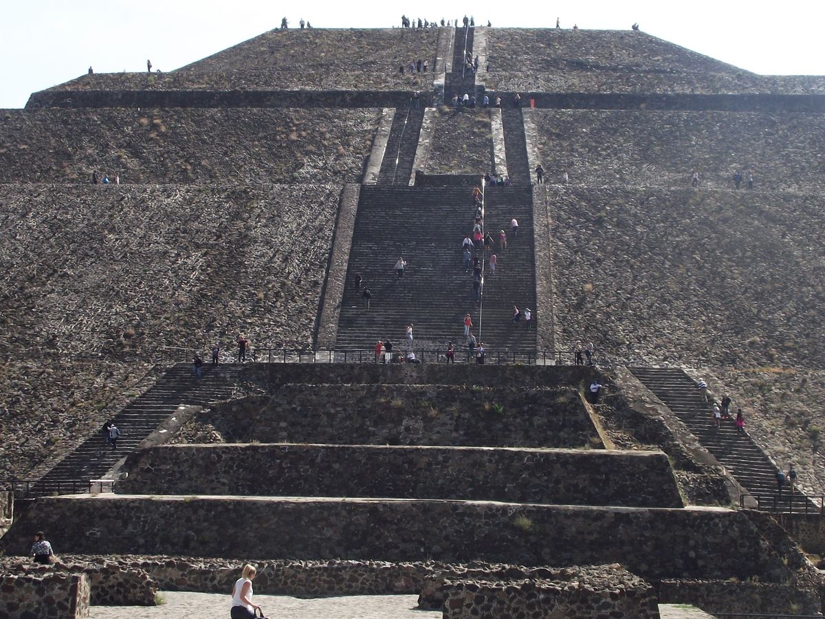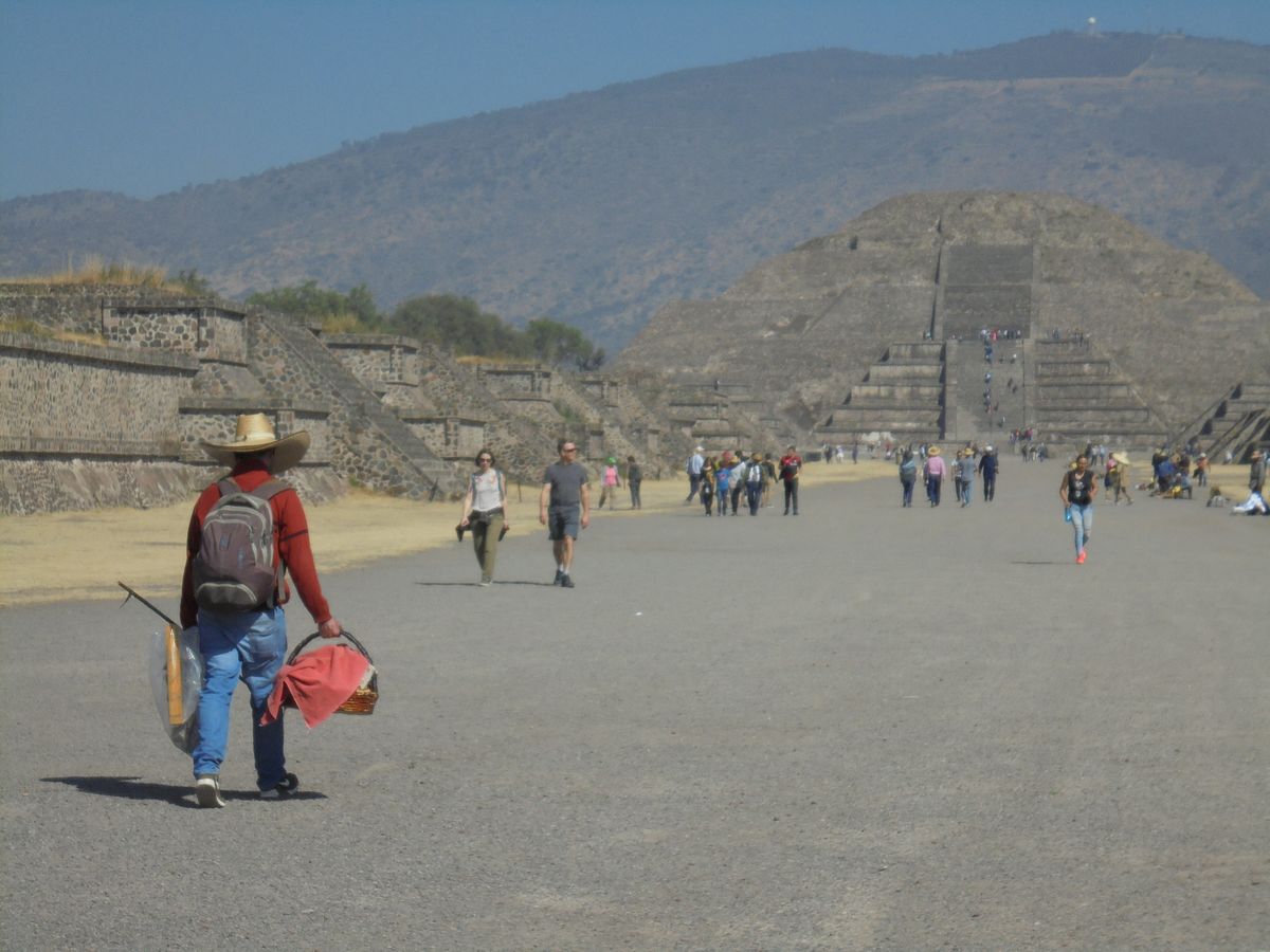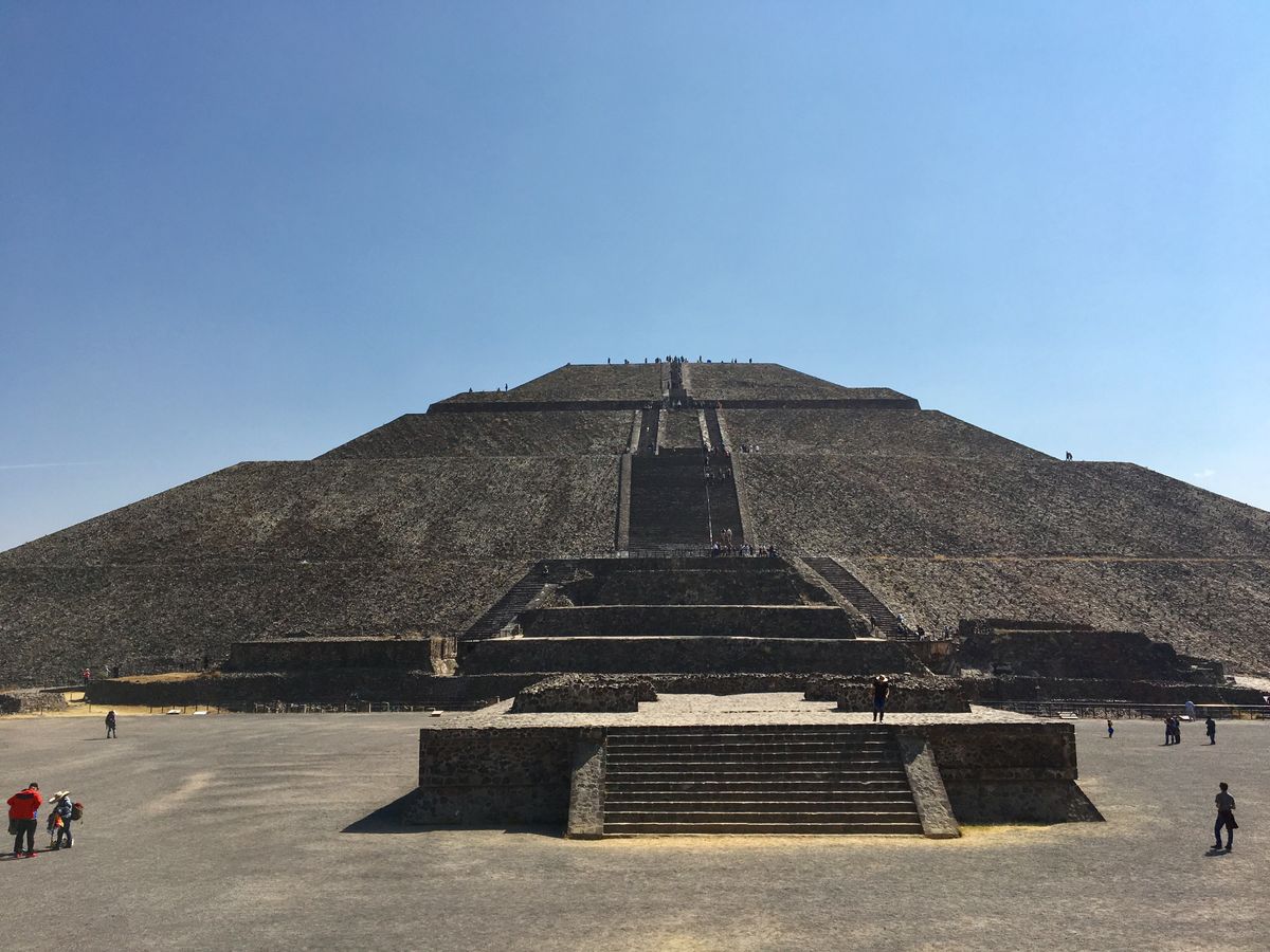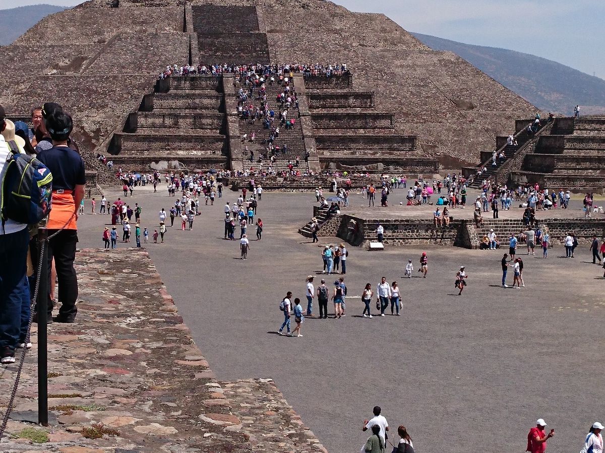 テオティワカン遺跡では英語のガイドさんが丁寧に説明してくれ、かつこちらも各ポイントでばっちり写真も撮ってくれます。マヤのチチェン・イッツァは過去に転落で死者がでてしまったため、今は登ることができませんが、ここのピラミッドは登ることができます。なかでも、太陽のピラミッドは、登ることのできるピラミッドの中で最大ということで、その規模の大きさに圧倒されます。一部手すりがない部分があったり、階段の踏面がとても狭かったりと、ちょっと怖いのですが、苦労して登った頂上から眺める景色もまた格別です。