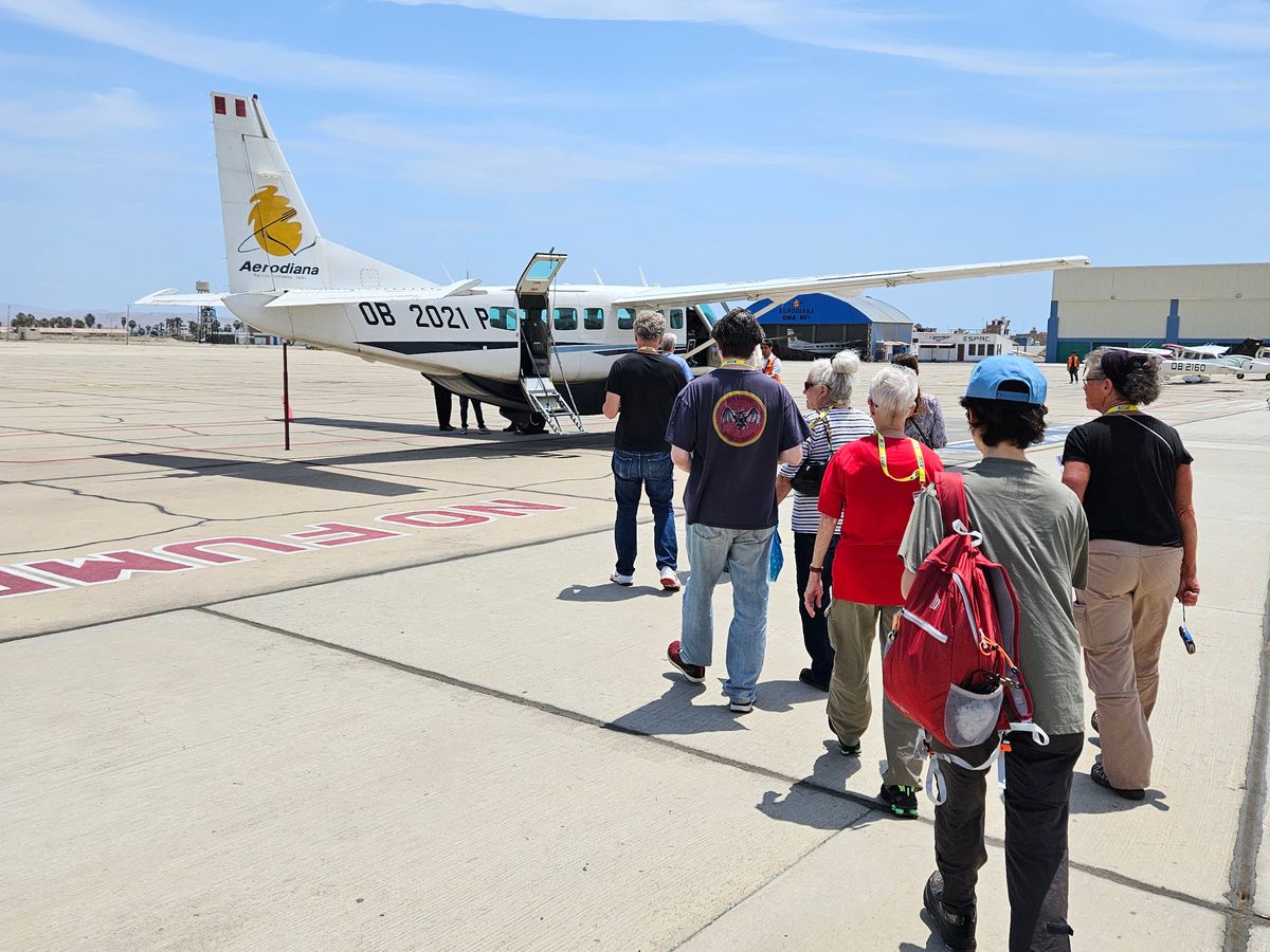 2人で利用。リマ市内のホテルまでタクシーが迎えに来てくれました。日本人ガイドがリマ市内からピスコの空港まで同行。途中、休憩もありました。空港からはセスナ機でイカの上空を飛んでナスカまで行き、様々な地上絵の上を旋回して見てまわりました。セスナ機内は狭く、別の外国人客も合わせて乗客は8名ほど。スペイン語、英語、カタコトの日本語で案内がありました。地上絵は小さくてすぐに通り過ぎてしまうものもありましたが、見たことのある有名な絵を実際に見れて満足しました。写真に撮るのは難しく、動画で撮るようにしました。急旋回を何度もするので、少し気分が悪くなりました。酔い止め薬は飲んでおくべきでした。個人的にはナスカまでの途中のイカの景色もとても良かったです。