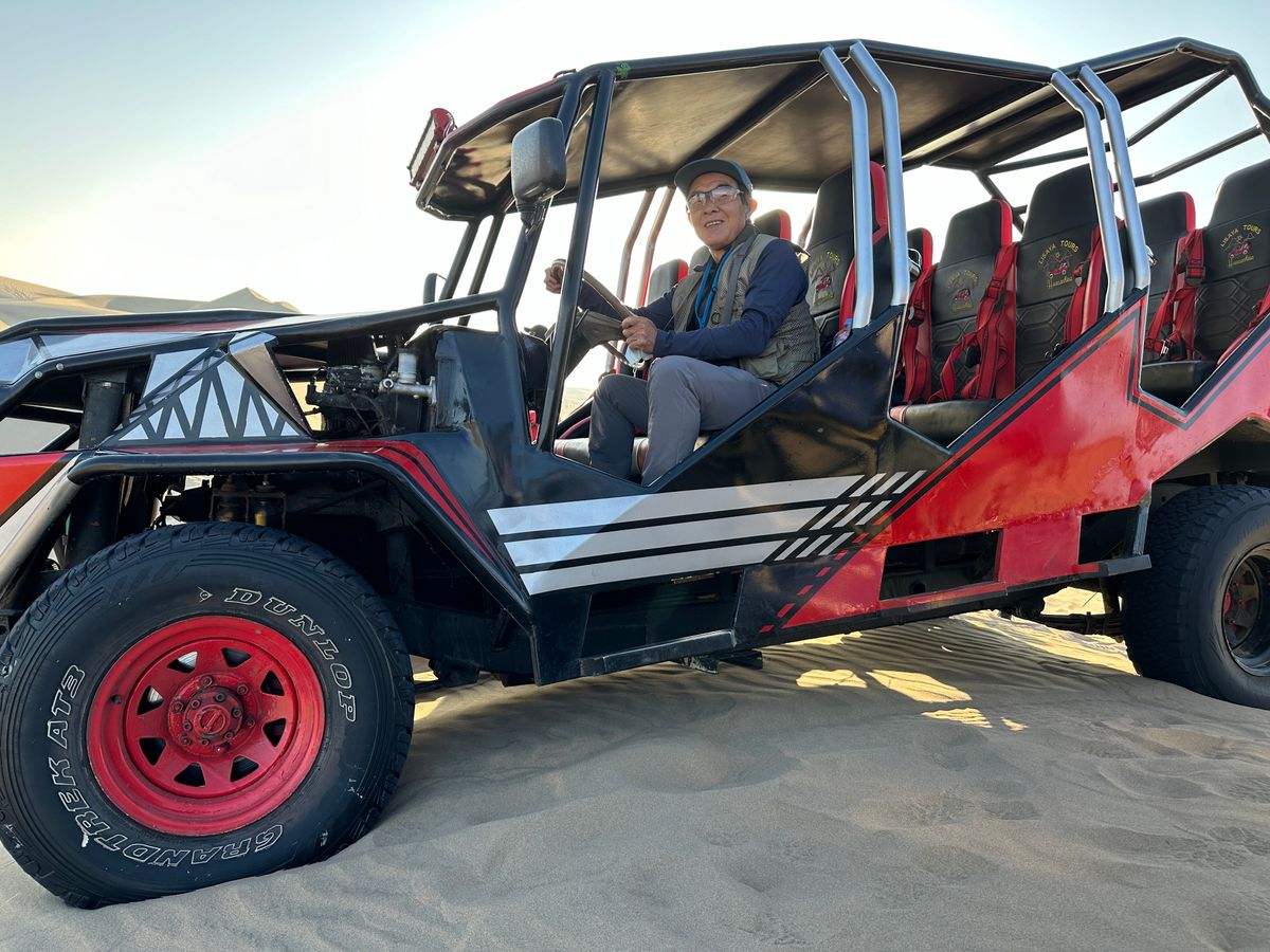 リマのホテルを午前4時に出発。英語ガイドのアントニオさんとドライバーさん、私の3名で長い一日を過ごします。1つ目の体験はパラカスのクルーズです。30人乗りの小さなボートで島を巡りながら野生の海鳥やアザラシを見ます。たくさんのペリカンやアザラシが見られ、ラッキーなことにフンボルトペンギンも見ることができました。桟橋に戻るとアントニオさんから、次のナスカ地上絵を見るフライトが強風のため遅れるとのことで、何もないピスコの空港で待つよりバラカスでランチをするのがお勧めと言われました。海沿いの街なのでセビーチェが食べたいと言うとレストランの店員さんに注文してくれました。白身魚、つぶ貝、イカ、エビが入った美味しいセビーチェをテラス席でゆっくりと頂きました。時間になってピスコの空港へ移動。この空港は地方の空港にしては立派で、新しくて大きさもそれなりの規模ですが、私たちが乗るナスカのフライト以外に全くお客がいなく、ガランとした感じに違和感を覚えました。10名のお客を乗せた小さなプロペラ機は30分かけてナスカの上空へ到着し、地上絵を見学します。右側の座席と左側の座席のどちらも地上絵が見られるように旋回しながら飛んでいきます。案内役の人が詳しく教えてくれるのでシャッターチャンスは逃しませんでした。特に蜘蛛やハチドリ、渦巻きがくっきりと見られて印象的でした。見学後はまた30分かけてピスコに戻ります。この間はぐっすり眠りました。無事に空港に着くと最後の目的地のワカチナ砂漠へ車で向かいます。車内でも眠っていました。到着後、バギーに乗る前にオアシスを見に行きました。鳥がいて多くの観光客で賑わっていました。私たちの順番が来て砂漠を少し歩いてバギーに乗り込みます。10名のチームで運転手さんの案内で砂漠を疾走します。かなりの揺れと迫力でジェットコースターのようなスリルがありました。砂漠の真ん中でバギーを降りて写真を撮ったりして過ごします。その後ボードに伏せて乗って砂漠の丘を降りる体験をさせてくれました。砂漠でこんなに砂まみれになって遊んだのは初めての体験です。夕日から日没まで砂漠で過ごして車に戻りました。そこからは一路リマへ。途中の休憩で立ち寄ったお店でチキンスープを食べましたがこれが美味しくて良い思い出になりました。ガイドのアントニオさん、ドライバーさんは早朝から深夜まで本当にお疲れさまでした。素晴らしい体験をすることができ感謝しています。ありがとう。