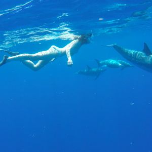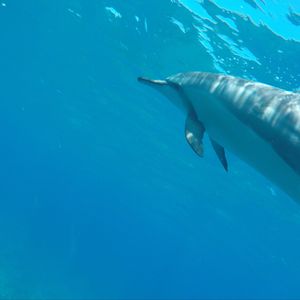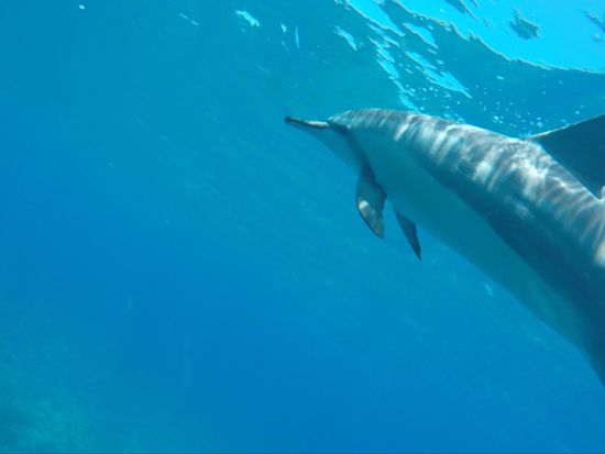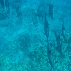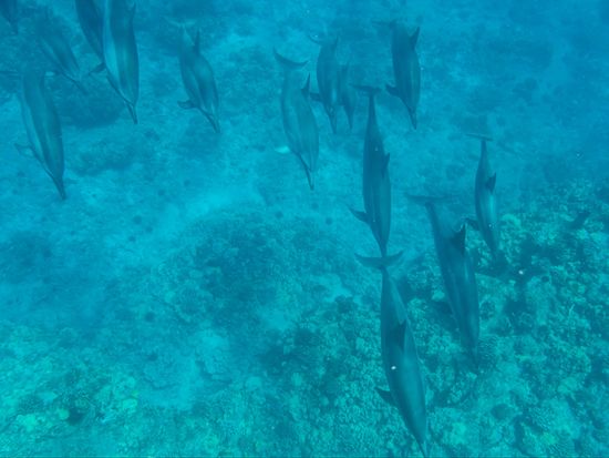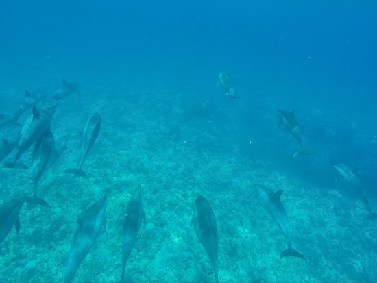 思わず息を飲むほど見事な景色でした!イルカの群れが近づいてくると、イルカの声がたくさん聞こえてきます。息をするために水際を泳いでいるイルカや海の底近くを泳いでいるイルカ、小さな子供のイルカとお母さん、とにかくたくさんのイルカを見ることができました。中には私たちのすぐそばを泳いでいくイルカもいました。シュノーケルでここまで体験できるとは本当に驚きました!!期待していた以上の体験でした。