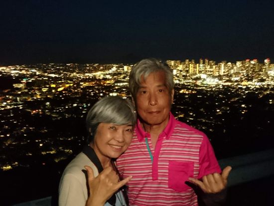 タンタラスの丘は夜は危ないと聞いていましたのでツアーをお願いしました。DFSの横でピックアップ。数台並んでいたのですが、特に表示もないのでどこで待ったらいいのか、少し不安でした。時間になると表示板を持った人が声掛けを始めましたのでほっとしました。結構人気で数台あるバンが満席でした。車の中でいろんなハワイの話をしながらの運転でしたので聞いてて楽しくためになりました。くねくねした道路もツアーなら安心です。道にそのまま斜めに停めますのでそんなに長くはいられませんが夜景を見るには十分の時間でした。ガイドさんが「危ないので保険のきいたスマホなら写真お撮りしますよ」と声掛けしてくれましたのでお願いしました。夜なのでうっかり落として壊してしまう人も多いみたいです。ライトを顔に当てて撮ってくれるのできれいに撮れました。いい思い出になりました。
