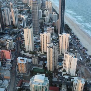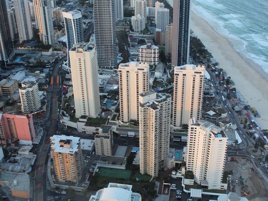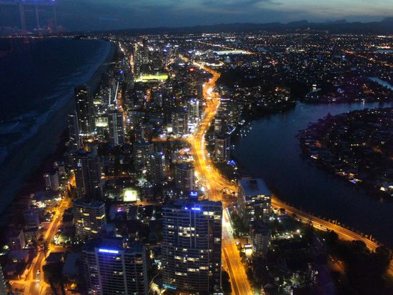 ゴールドコーストに初日に行きました。夕方前に行って見晴らしを楽しみ、そのままカフェでお茶をして時間を過ごし、夜景も楽しんでから帰りました。初日に行ったので、周辺を上から見ることができ今後の行動場所などを上から確認できたのが良かったです。トラムだとカヴィルアベニューから1駅ですが歩いても10分ぐらいなの、通りを楽しみながら歩いていきました。ちょうど、展望台を歩いて上に登るツアーに参加している人がいて、ガラスの外の階段を下りてくるところでした。外は強風が吹いていて安全帯を付けているとはいえ、見ていてすごいなと感心してしまいました。