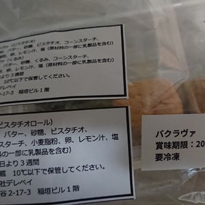 何重にも重ねたパイ生地にピスタチオやくるみの砕いたものと甘いシロップがかかっているお菓子と、ピスタチオの練った生地のお菓子です。