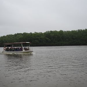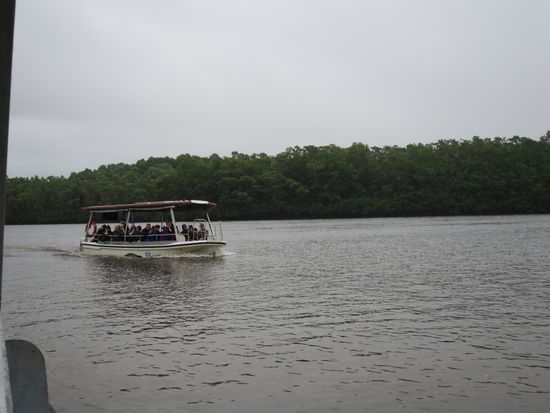 デインツリー・リバー・クルーズ は別のガイドさんが案内してくれます。英語でワニの生態について熱弁してくれます。何メータークラスのワニがいるか、何度になったら死んでしまうとか、環境についてなどを速いスピードで話すので必死で聞かないとついて行けなくなります。ワニが見れたらいいや〜と思って英語を気にしなければ、とくに何も問題ないかと思います。野生のクロコダイルを3頭見ました。ここでは土砂降りの雨に見舞われました。ボートに屋根はありますが。雨が降り込んできます。山用レインウェアの上着だけ着ていましたがお尻がぬれてしまいました。土産物売り場で売っているビニール袋のポンチョを着ている人たちは丈が長いので平気そうでした。(船に乗り込む前にトイレの案内があります。先にトイレを済ませてください。私が参加したツアーではボートに乗ってから以降トイレ休憩はありませんでした)