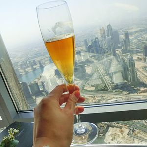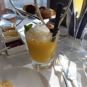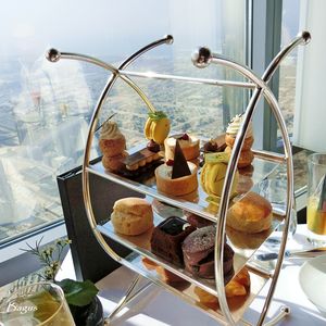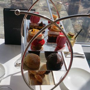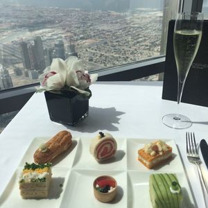 アフタヌーンティーで行きましたが、前菜、主菜、デザート。いわゆるスコーン、ケーキ等のみがアフタヌーンティーと想像してたので、お腹一杯になりました。もちろん美味しかったです。ウェルカムドリンク付きで、バウチャーにはアルコール含まず、とありましたが、シャンパン1本が無料でした!たぶん、遊覧飛行のヘリコプターだと思いますが、我々はそれよりも高い位置で食事しているのが、驚きでした。トイレの手洗い場がガラス張りで、ドバイモールを見下ろす、これまた、絶景ポイントでした。