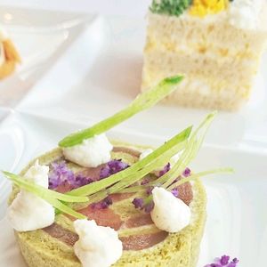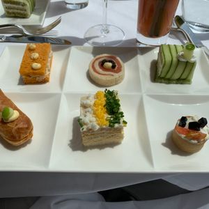 メイン料理まで付くランチを兼ねたアフタヌーンティーです。1人だとスパークリングワインは2杯半までみたいですが、3杯サービスしてくれました。アミューズはカボチャのスプーマの中にコロッケが入った物、サンドイッチプレートはフォアグラやキャビアを使った物やトマトのコンソメスープ等どれも可愛くて美味しかったです。メインは2種類から選択出来、この日はホタテかチキンで、ホタテを選びましたが綺麗な盛り付けでポワレの状態も良く満足。