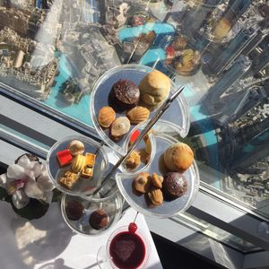 通常の展望台に入るか、アトモスフィアのアフタヌーンティーにするか悩んだ末、アフタヌーンティーにして良かったと思います。まずアルマーニホテルのフロントからVIP扱いでレストランの席まで案内してくれ、ウエルカムシャンパンも飲み放題であり、食事そのものもおいしかったです。