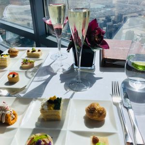 アルマーニホテルまではタクシー。12時半集合と記載があり、12時に到着。13時までロビーで待機。アトモスフィア直通のエレベーターで向かう。案内された席は直射日光が当たらず、噴水がや見えベストポジション。スタッフが飲み物の説明をしてくれるが、早口の英語であまり聴き取れず。シャンパンをボトルで開け一本はプラン内。お料理はアミューズ、サンドイッチの盛り付けが綺麗。メインのチキンは味が物足りない感じでかなり普通。お茶リストから紅茶を頼むと、スタッフがすぐにカップに注いだため、薄くてお湯の味。しばらくポットに置いてから、二杯を入れてみたが、不味い。美味しいお茶を期待していたため残念。カフェラテは美味しかったのでおススメ。デザートのスコーンまで食べるとお腹がいっぱいになった。全体的には景色をのんびり楽しめて満足。