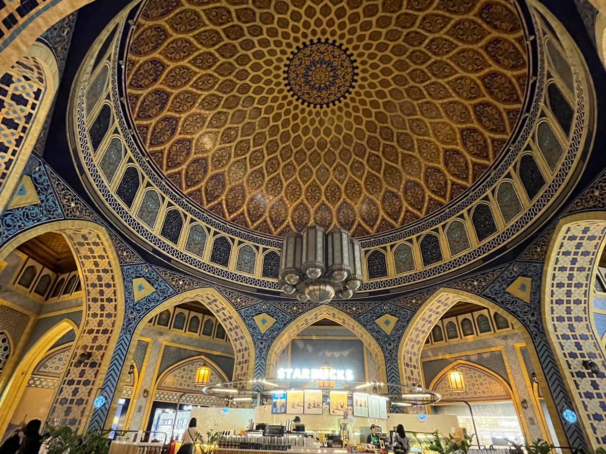 グランドモスクに到着。地下アーケードを通ってモスクに入ります。入り口の前に入場券(無料)を登録するQRコードがあるので、登録完了し、いざ入場。モスクは真っ白でとても美しかったです。外観もさることながら、内観も素敵でした!モスクにある1096本の柱は大理石のプレートにラピスラズリ等の半輝石でお花の模様があしらわれていて、とても素敵です。有名なシャンデリアや絨毯も圧巻でした!90分の見学時間でしたが、3時間くらいかけてもっとゆっくり見たかったです。服装に気を使ってTシャツ・パーカー・ジーパンで行ったのですが、アバヤを購入すれば良かったなぁとちょっと後悔しました。