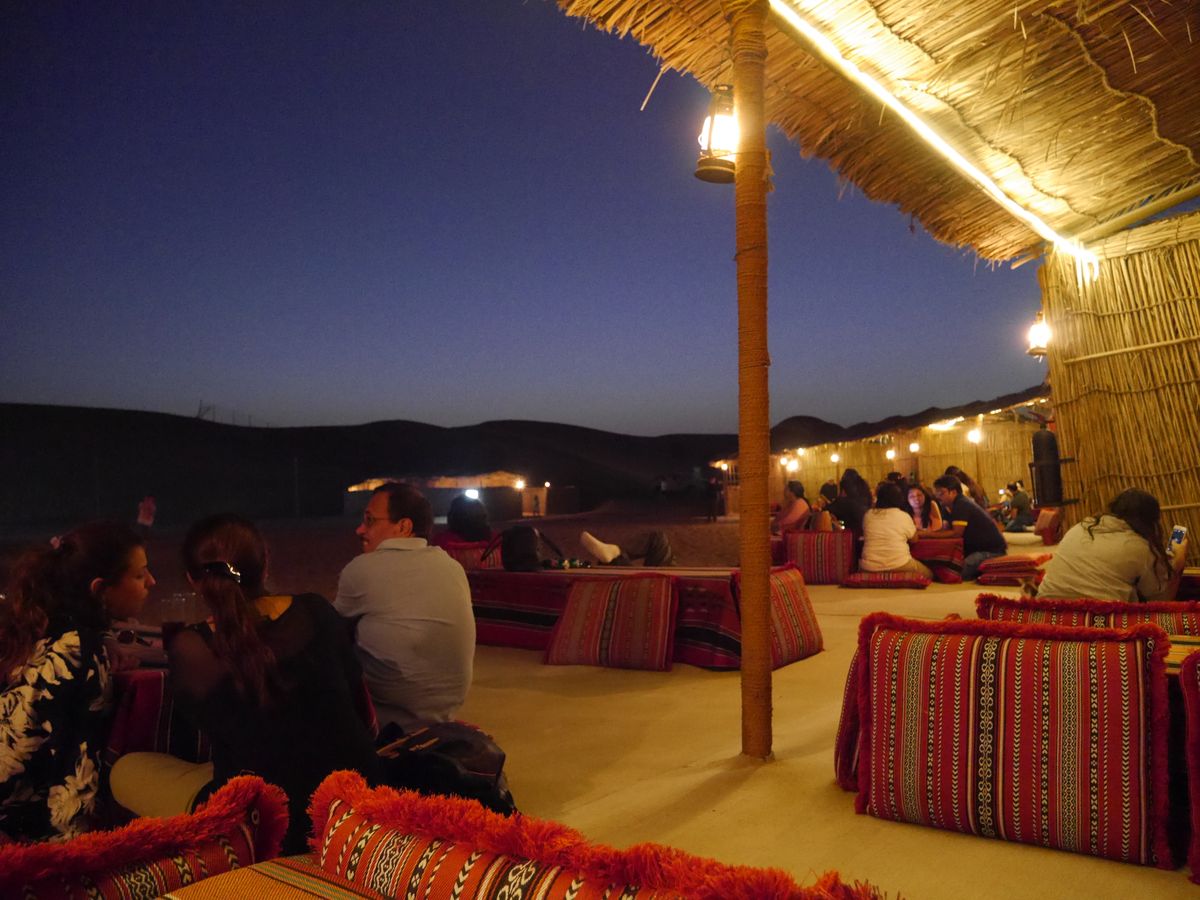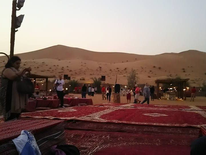 私は事前に酔い止めを飲んでいましたが乗り物酔いしやすい方、絶叫マシン等があまり得意ではない方はそれでも少し酔うかもしれません。でも1時間続けてではなく、途中でサンセット含め2ヶ所フォトポイントとして下車するので、外の空気も吸えますのでご安心を。その後、キャンプ?のような所に到着し、フリータイム。そこにはヘナタトゥーやシーシャ、ラクダ乗りも楽しめます。自分の席を先に確保しておいた方がいいかも。少しすると食事が徐々に出来上がり、係の方が声かけをしてくれるので、自分達で取りに行きます。食事も3段階で声かけしてくれます。(1回目はコロッケのようなものやラップサンドなど、2回目はサラダやメインディッシュ、ライスやパン、3回目はデザート)食事が終わる頃にベリーダンスショーが突然始まり、15分程のショーを楽しんだ後は電気が消えて星空観測。電気が点いたら自分達の車まで帰ります。混雑時期という事もありましたが出発が遅くなると、砂漠エリアを出てすぐに空気を入れるエリアが行列になり帰りが遅くなりますので、できるだけ早めに車に戻った方が良いと思います。ツアー自体は英語が全くできない私達でも十分に楽しめました。服装は少し肌寒いので羽織ものはあった方が良いです。靴はスニーカーでも行けますが砂が入るのでサンダル、裸足がサファリの際にはオススメです。