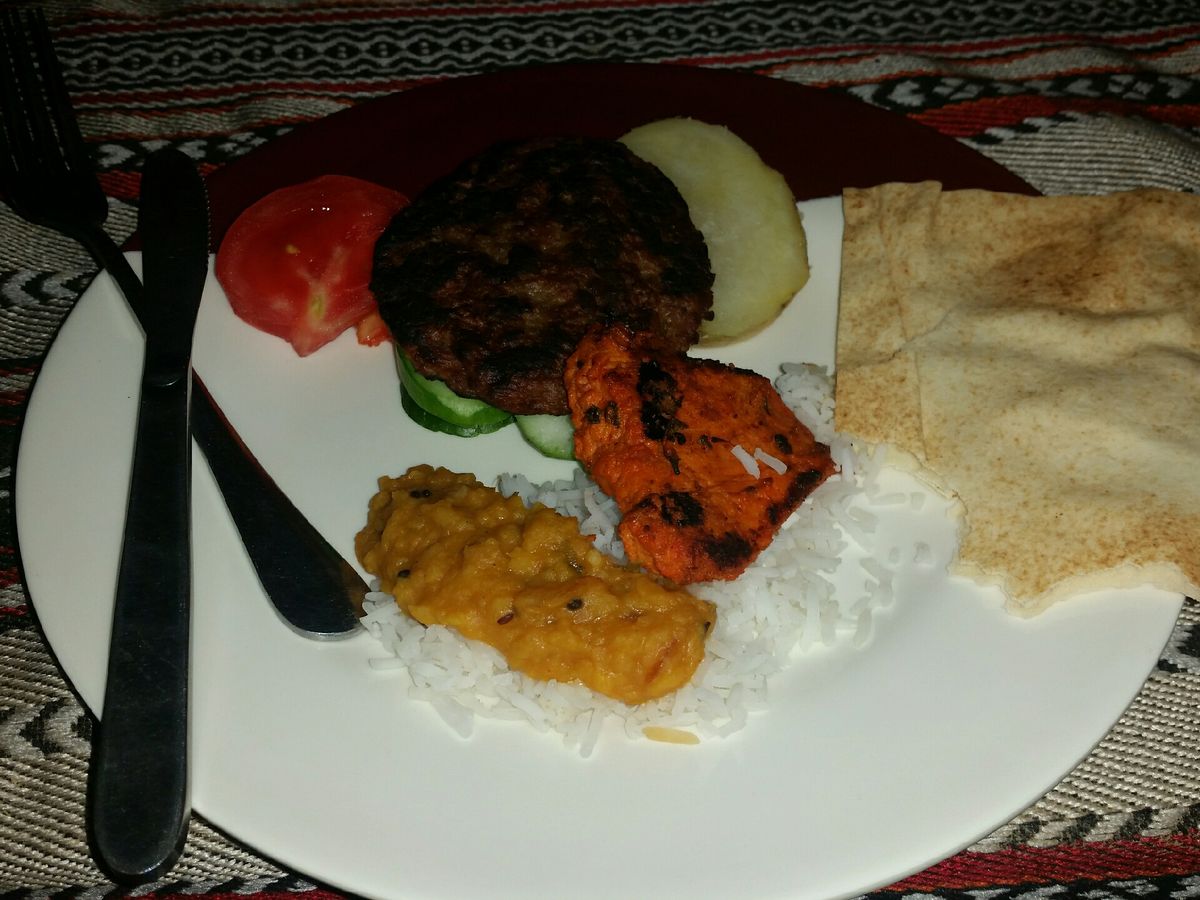 休憩兼夕飯は砂漠と満天の星空の中食べるBBQ。野外で食べると思えないくらい美味しい食事でした。タンドリーチキンとハンバーグのようなものが炭の香りが香ばしかったです。