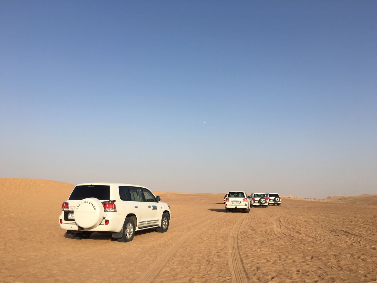 初めてのドバイで、入国日にこのツアーに参加してきました!朝7時頃にドバイに着き、そこからホテルまで行き荷物だけ置いてツアーのピック時間までバキスタヤ地区に散策に出かけました!ツアーが午後発だったのでたっぷり散策をすることが出来ました。そこからホテルへ戻り、ツアーの車に乗り砂漠へ。1時間半ほど車に乗り、砂漠へ到着!普通の車道からいきなり砂漠へ走り出したので驚きました(笑)ミーティングポイントで他の車に数十台と合流しました。全車合流までの間、砂漠でたくさん写真を撮りました。集まったところでドライブ開始です。車が一列になり走ります。ほんとに倒れるんじゃないかと思うくらいスリル満点で最高でした!!!個人的にはもっとスピード出して欲しかったですが、、(笑)時間も長くたっぷり楽しめます。その後また写真タイムに入り、ラクダの牧場?的なとこでも写真タイム。そこからキャンプに向かい、ラクダに乗ります!時間は短いですがラクダに乗れただけで大興奮。そのあとヘナタトゥー、サンドボード、水タバコなど個々に体験が出来ます。私的にはヘナタトゥーが魅力的でした。綺麗な女の人が2,30秒でかきあげてくれました。デザインもとても素敵でした。そのあともブッフェスタイルのご飯にショーなど自由に楽しめます。すこしご飯の時間が長いかな、、と思いましたがゆっくりしたい人にはちょうどいいと思います。上着は必須です。冷えます。砂まみれになるので砂漠についたらビーチサンダルに履き替えました。でもキャンプではほぼ裸足で行動してました(笑)とにかく午後からなのにとても充実した半日になりました!